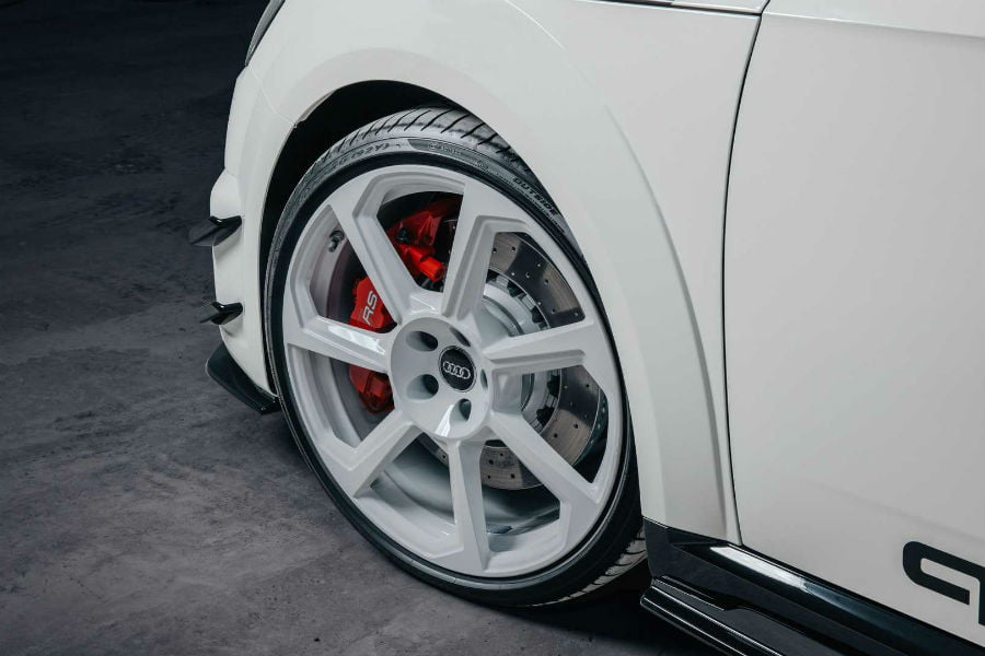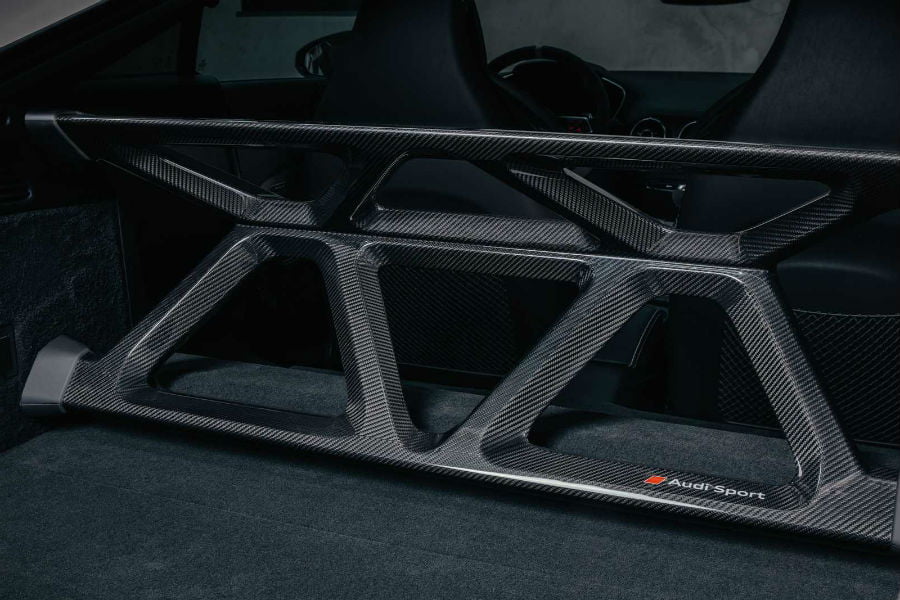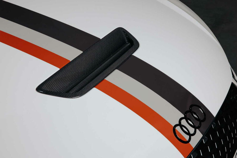 Οι μαύρες gloss λεπτομέρειες σε καλύμματα καθρεπτών, πλαϊνές ποδιές και αεροδυναμικές προσθήκες στους προφυλακτήρες συμπληρώνουν το οπτικό πακέτο, εννοείται σε συνάρτηση με τις λευκές 20άρες ζάντες και τις κόκκινες δαγκάνες των φρένων πίσω από αυτές. Τα σήματα της Audi στα ακροπτερύγια της αεροτομής και η ανθρακονημάτινη εισαγωγή στο καπό, αποτελούν επίσης μοναδικές λεπτομέρειες.