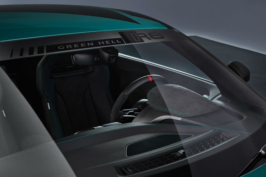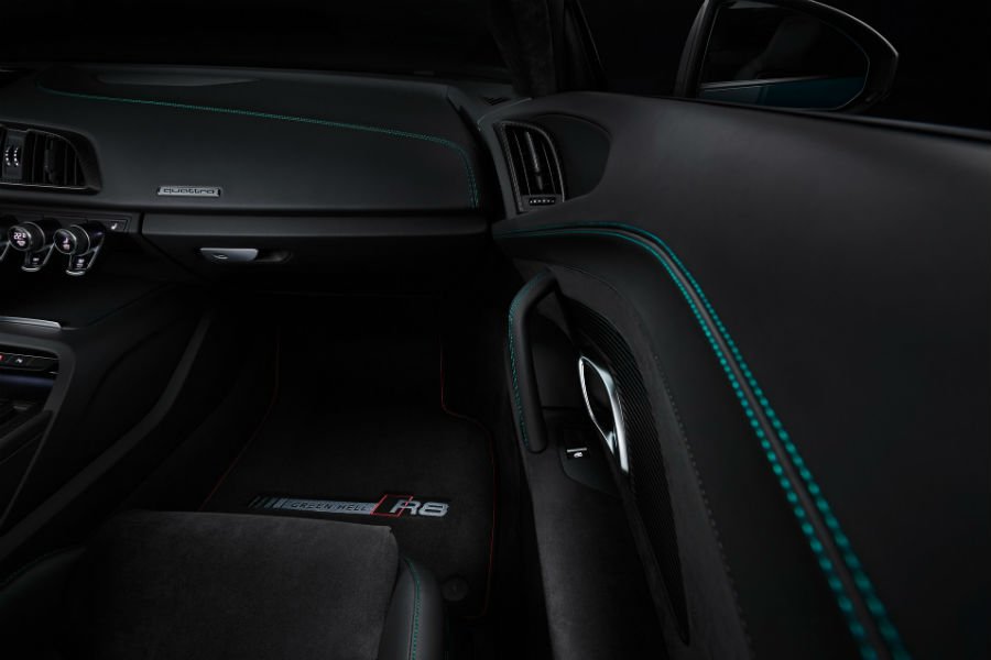 Το R8 Green Hell Edition παραπέμπει ευθέως στο αγωνιστικό που μεγαλουργεί στην «Πράσινη Κόλαση», με το συνδυασμό του πράσινου χρώματος στο αμάξωμα και του κόκκινου στις 20άρες ζάντες. Επίσης, υπάρχουν μαύρες ματ πινελιές στις κολώνες, τους καθρέπτες, την οροφή, το καπό και τις πλαϊνές εισαγωγές του κινητήρα, όπου συναντάμε και την προσδιοριστική επιγραφή «Green Hell» (το ίδιο αυτοκόλλητο και στην κορυφή του παρμπρίζ). Αν το πράσινο χρώμα δεν είναι της αρεσκείας σας, μπορείτε να επιλέξετε μεταξύ των Ibis White, Daytona Gray και Mythos Black.
