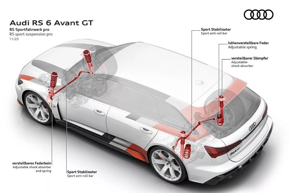Το κορυφαίο και αγωνιστικών καταβολών RS 6 μόλις παρουσιάστηκε στην Αμερική, τόσο στα χρώματα το 90 IMSA GTO (με βάση το Arkona White) όσο και στο κλασικό, «τευτονικό», Nardo Grey. Εδώ οι κόκκινες πινελιές γίνονται μαύρες, δημιουργώντας ίσως τον πιο απειλητικό χρωματικό συνδυασμό στο GT, μετά το κατάμαυρο Mythos Black Metallic. Φυσικά τεράστιο ρόλο στο στο μαγνητισμό των βλεμμάτων παίζουν οι νέες 22άρες ζάντες, το εντονότερο αεροδυναμικό πακέτο (βγάζουν μάτι το splitter μπροστά και ο διαχύτης πίσω), αλλά και το χαμήλωμα της ανάρτησης κατά 10 χλστ. Το GT, ωστόσο, δεν περιορίζεται στις αισθητικές αναβαθμίσεις.