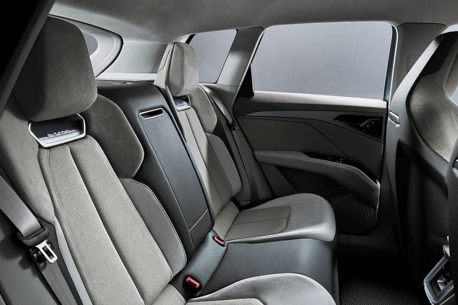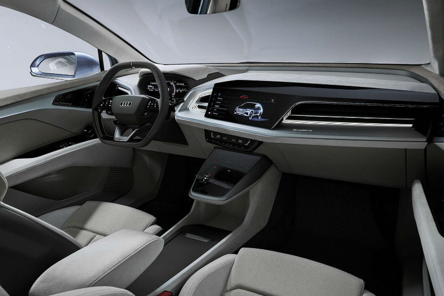 Στο εσωτερικό ξεχωρίζει η οθόνη αφής των 12,3 ιντσών στο κέντρο του ταμπλό, η οποία είναι και γυρισμένη προς την πλευρά του οδηγού τονίζοντας τον σπορ χαρακτήρα που ευαγγελίζονται τα μοντέλα Q ζυγού αριθμού (Q2, Q4, Q8). Το δέρμα συναντάται παντού, με την Audi να δηλώνει πως μπορεί από πλευράς εξωτερικών διαστάσεων το Q4 e-tron να τοποθετείται στα compact crossover, όμως το μεταξόνιο των 2,77 μέτρων προσφέρει χώρους τουλάχιστον μιας κατηγορίας πάνω.