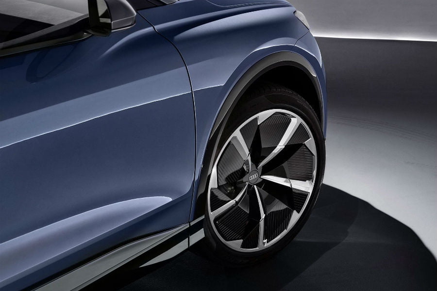 Το Q4 e-tron ξεχωρίζει εμφανισιακά χάρις στην τεράστια μάσκα και τις αναλόγου μεγέθους εισαγωγές του προφυλακτήρα, δίνοντας ένα άκρως απειλητικό παρουσιαστικό στο γερμανικό crossover. Το λογότυπο «e-tron» στο κάτω μέρος είναι φωτιζόμενο, αλλά όπως και οι θεόρατες ζάντες των 22 ιντσών, δύσκολα θα καταφέρουν να περάσει στην έκδοση παραγωγής. Αυτοί που θα περάσουν σίγουρα είναι οι πλευρικοί καθρέπτες, καθώς σε αντίθεση με το μεγαλύτερο e-tron, το Q4 δεν διαθέτει κάμερες για τον έλεγχο της κίνησης πίσω. Συνεχίζοντας στο αμάξωμα, παρατηρούμε τους φαρδείς ώμους στις πίσω πόρτες και την κεκλιμένη γραμμή της οροφής, μαζί με τα λεπτά φωτιστικά σώματα που ενώνονται με την -χαρακτηριστική για Audi πια- φάσα δίνοντας την αίσθηση αυξημένου πλάτους και χαμηλότερου ύψους. Με δυο λόγια, τεχνοτροπία κουπέ.