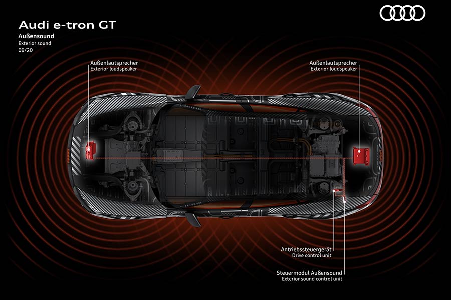 Όπως με κάθε ηλεκτρικό αυτοκίνητο, το e-tron GT διαθέτει επίσης το υποχρεωτικό σύστημα ηχητικής προειδοποίησης (Acoustic Vehicle Alerting System – AVAS), αν και ενσωματωμένο σε ένα ευρύτερο ακουστικό φάσμα. Ένα μεγάφωνο τοποθετημένο στο μπροστινό μέρος του οχήματος εκπέμπει τον ήχο AVAS. Σε χαμηλή ταχύτητα – μετά τα 20 χλμ./ώρα στην ΕΕ και τα 32 χλμ./ώρα στη Βόρεια Αμερική – γίνεται σταδιακά πιο αθόρυβο και δεν ακούγεται μετά τα 60 χλμ./ώρα. Για τους πελάτες που παραγγέλνουν το προαιρετικό πακέτο ήχου, ένα δεύτερο, μεγάλο ηχείο προστίθεται στο πίσω μέρος. Παράλληλα, δύο ηχεία στο εσωτερικό παρέχουν μια συναισθηματική εμπειρία ήχου. Δύο μονάδες ελέγχου αναμιγνύουν συνεχώς τον ήχο του e-tron GT με βάση μεταβλητές όπως η ταχύτητα ή η επιτάχυνση.