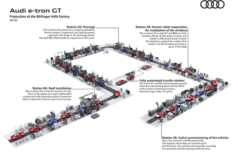 Η παραγωγή του θα ξεκινήσει στο τέλος του 2020. Η μονάδα στο Böllinger Höfe εξειδικεύεται σε μικρής παραγωγής μοντέλα, με ιδιαίτερη σημασία στη λεπτομέρεια – εδώ κατασκευάζεται το R8, από το 2014. Η ενέργεια που θα χρησιμοποιείται για την παραγωγή του Audi e-tron GT θα προέρχεται 100% από ανανεώσιμες πηγές, με το βιοαέριο να παρέχει κλιματικά ουδέτερη θερμότητα.