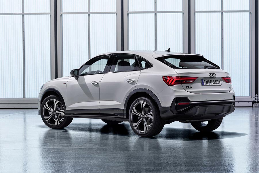 Αυτό ξεχωρίζει από την πιο έντονη κλίση της οροφής και του πίσω παρμπρίζ, το ανασηκωμένο τελείωμα του καπό που σχηματίζει μια αεροτομή και τον πιο δυναμικό προφυλακτήρα με το διαχύτη. Επιπλέον, το Q3 Sportback είναι πιο μακρύ κατά 16 χλστ. (4.500 χλστ.), πιο στενό κατά 6 χλστ. (1.843 χλστ.) χαμηλότερο κατά 9 χλστ. (1.567 χλστ.) και έχει το ίδιο μεταξόνιο των 2.680 χλστ. Στα πλαϊνά του σχηματίζει πιο έντονους ώμους, που τονίζουν ακόμα περισσότερο το πλάτος του και του χαρίζουν πιο μυώδη εμφάνιση. Μπροστά διακρίνεται ο νέος προφυλακτήρας και η μαύρη μάσκα, που τονίζουν με την σειρά τους την πιο αθλητική του εμφάνιση.