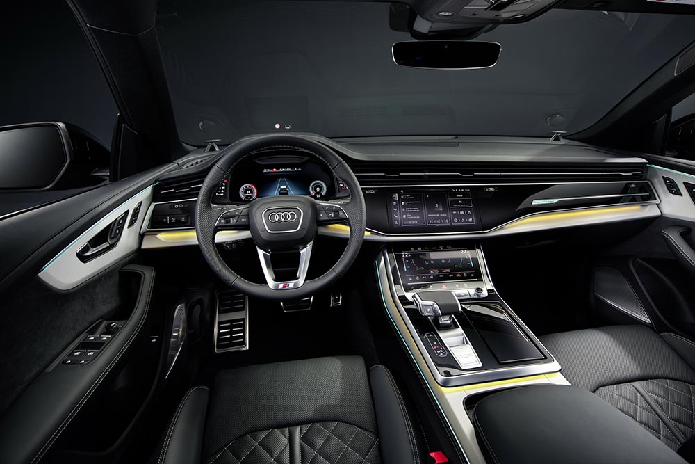 Αναβαθμισμένος και ο εξοπλισμός του Audi Q8, όπως είναι σε υλικά του εσωτερικού με το δερμάτινο σαλόνι και στα διακοσμητικά, ανάλογα την έκδοση. Για τη γκάμα των ζαντών, η Audi προσφέρει στους πελάτες μια επιλογή από πέντε νέα σχέδια, με μεγέθη που κυμαίνονται από 21 έως 23 ίντσες. Η Audi επεκτείνει και τις εφαρμογές, προσθέτοντας για παράδειγμα Spotify ή Amazon music. Βελτιωμένες με τη σειρά τους είναι και οι ψηφιακές οθόνες στο ταμπλό για τον πίνακα οργάνων και το infotainment.