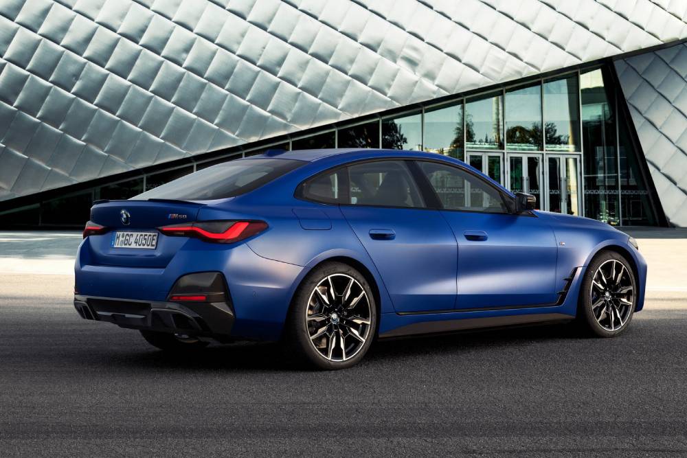 Το Frozen Portimao Blue χρώμα, μαζί με τις μαύρες και ανθρακονημάτινες λεπτομέρειες στο αμάξωμα χαρακτηρίζουν το παρουσιαστικό της i4 M50, που αποκτά τη δέουσα επιθετικότητα για μοντέλο του M GmbH μέσω των νέων προφυλακτήρων και των ζαντών 19 ιντσών (προαιρετικά 20). Πίσω από αυτές κρύβονται αναβαθμισμένα φρένα M Sport, ενώ το στήσιμο ανατίθεται στα ηλεκτρονικά ελεγχόμενα αμορτισέρ M Adaptive.