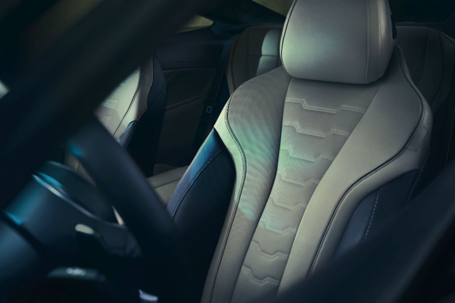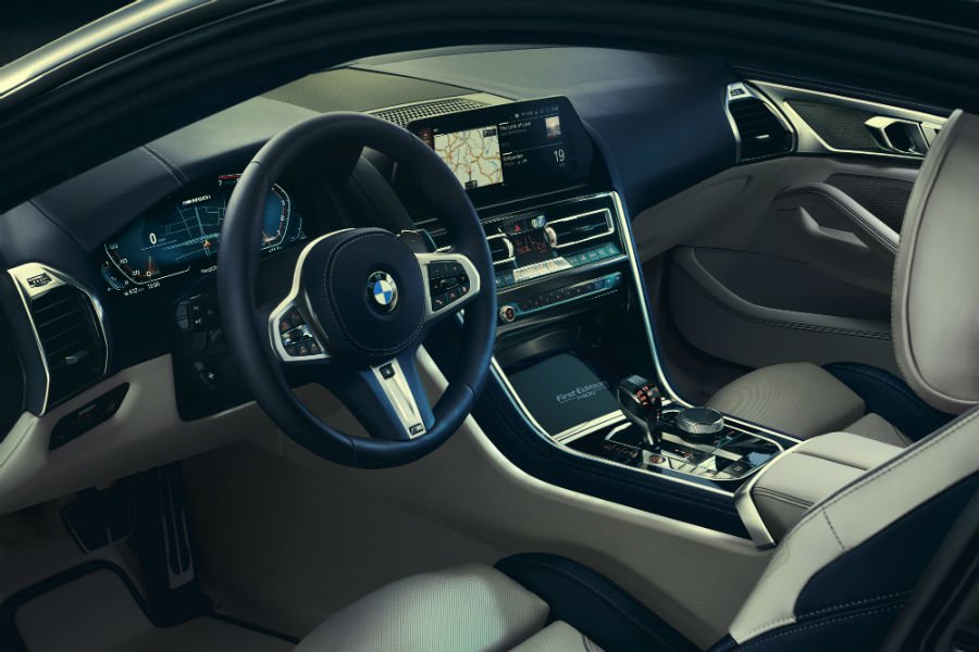Στο εσωτερικό ο τόνος αποκλειστικότητας που αποπνέει η First Edition επιτείνεται με ειδικά στιλιστικά στοιχεία από το πακέτο Individual, με τον συνδυασμό της δερμάτινης επένδυσης Merino στον χρωματισμό Ivory White/Night Blue να αποτελεί προνόμιο της M850i xDrive. Φυσικά δεν θα μπορούσε να λείπει το δερμάτινο τιμόνι M και η επένδυση οροφής από alcantara, αμφότερα σε Night Blue απόχρωση, ενώ παρόντα δηλώνουν και τα ανάλογα σήματα «First Edition» με αριθμημένη πλακέτα παραγωγής.