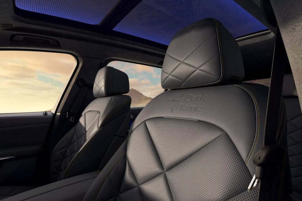 Προχωρώντας στο εσωτερικό, συναντάμε παντού δέρμα και κορυφαίας ποιότητας υλικά, μαζί με μαύρες επενδύσεις από συνθετικό δέρμα Premium Sensafin για τα καθίσματα και μια σκούρα γκρι επένδυση alcantara γύρω από τη στάνταρ πανοραμική ηλιοροφή του «έναστρου ουρανού». Το σκοτεινό εσωτερικό διαθέτει χρυσές ραφές και ενθέσεις από ανθρακονήματα στο ταμπλό και την κεντρική κονσόλα, για ακόμα περισσότερο exclusivity.