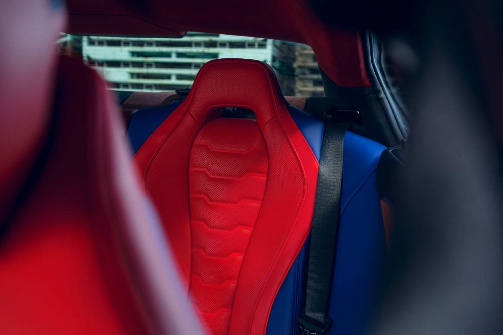Η καμπίνα των επιβατών εμφανίζεται πιο συγκρατημένη, αν και το κυανέρυθρο χρώμα στις δερμάτινες επενδύσεις των καθισμάτων κάνει ξεκάθαρη νύξη στη στολή του Spiderman. Ο βυσινί «ουρανός» και οι κόκκινες ραφές στις μπεζ επενδύσεις ακολουθούν τις προσταγές του μοτίβου, ενώ η ονομασία του μοντέλου και η υπογραφή του καλλιτέχνη στο κάλυμμα της θήκης, στη βάση της κεντρικής κονσόλας, δίνουν τη δέουσα νότα αποκλειστικότητας.