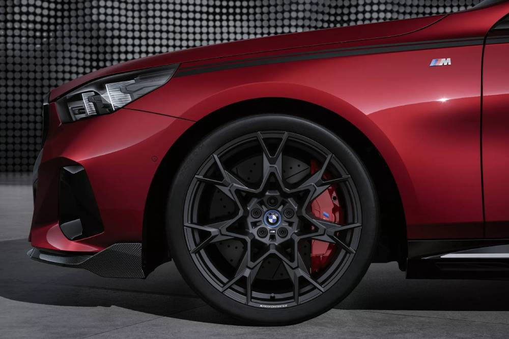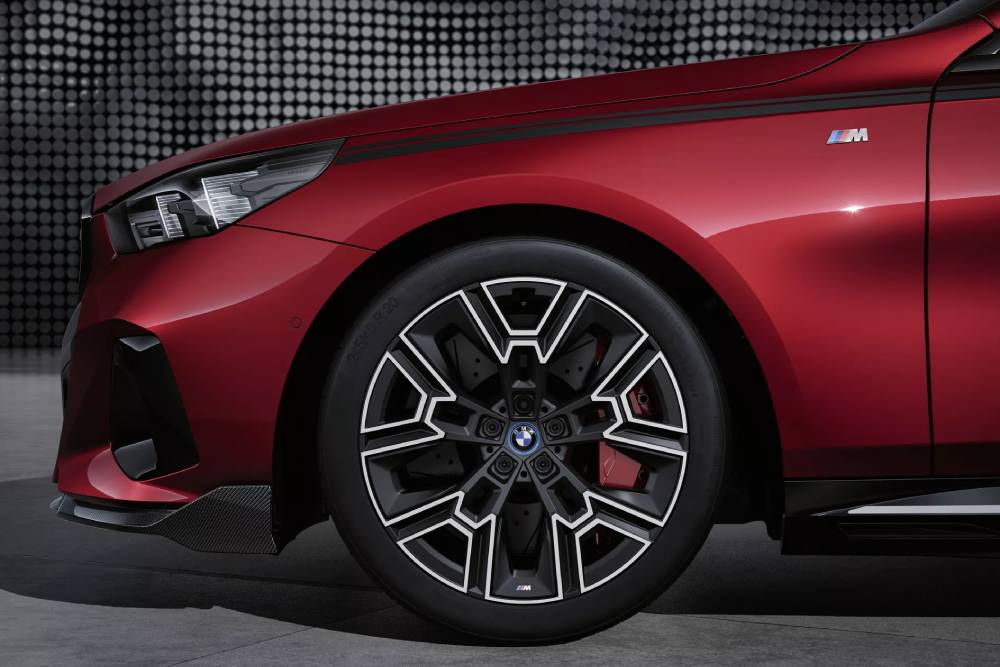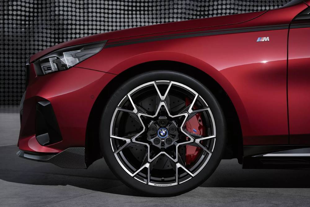 Τρία διαφορετικά σχέδια ζαντών σε διαστάσεις 19-21 ιντσών προσφέρονται, με τις επιλογές στους χρωματισμούς να περιλαμβάνουν Jet Black Matt, Bicolor και Frozen Midnight Grey εκφάνσεις. Πίσω από αυτές κρύβονται σημαντικές αναβαθμίσεις, που αφορούν την απόδοση της μεγαλομεσαίας Βαυαρής κατά το φρενάρισμα. Η BMW προαιρετικά προσφέρει ένα ιδιαίτερα αναβαθμισμένο σύστημα πέδησης, που αποτελείται από μεγαλύτερες τρυπητές δισκόπλακες εμπρός-πίσω και 6πίστονες δαγκάνες μπροστά (1πίστονες πίσω). Βελτίωση πέρα για πέρα καλοδεχούμενη, ειδικά στην i5 που ξεπερνά τους 2,1 τόνους σε βάρος (2.380 κιλά η M60 των φωτογραφιών). Οι δαγκάνες βάφονται σε βαθύ κόκκινο, πάντα με το «Μ» και την τριπλέτα μπλε-γαλάζιου-κόκκινου δίπλα του.