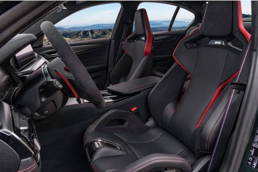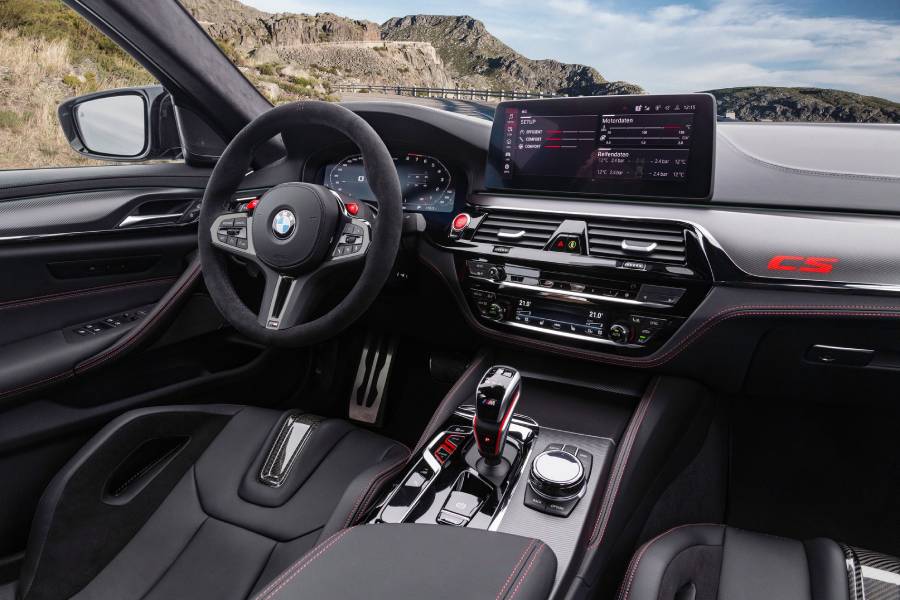 Στο εσωτερικό συναντάμε δερμάτινες επενδύσεις Merino μαύρου χρώματος, με πινελιές Mugello Red και κόκκινες ραφές. Το ανθρακόνημα βρίσκεται παντού: από το ταμπλό, την κεντρική κονσόλα και τις πόρτες, μέχρι τα μπάκετ καθίσματα που είναι εξ ολοκλήρου κατασκευασμένα από carbon και φιλοξενούν φωτιζόμενα λογότυπα «M5». Μοναδική λεπτομέρεια η χάραξη του Nurburgring, που είναι ραμμένη στα προσκέφαλα.