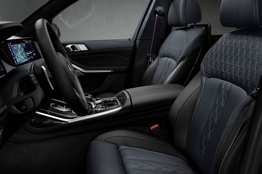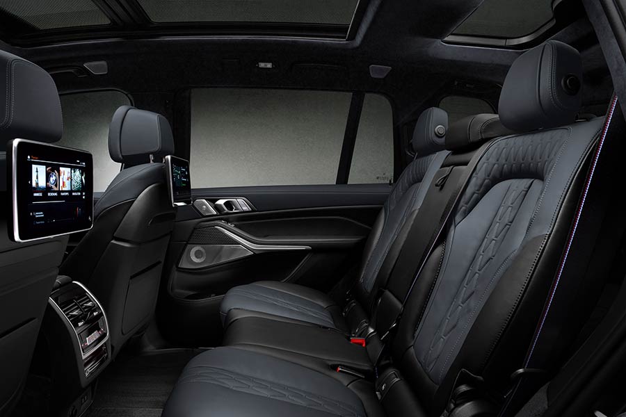 Ένας εντυπωσιακός συνδυασμός σπορ ταπεραμέντου και πολυτέλειας χαρακτηρίζει επίσης το εσωτερικό του μοντέλου, που διατίθεται με έξι ή επτά καθίσματα. Οδηγός και συνοδηγός απολαμβάνουν την ανώτερη σπορ αίσθηση του πολυτελούς SAV σε ηλεκτρικά ρυθμιζόμενα, αναπαυτικά καθίσματα με λειτουργία μνήμης. Ένα δερμάτινο τιμόνι M και στοιχεία εξοπλισμού BMW Individual, ειδικά σχεδιασμένα για την BMW X7 Edition Dark Shadow, μαρτυρούν το ανώτερο επίπεδο αποκλειστικότητας. Σε αυτό συνεισφέρει η πλήρως δερμάτινη επένδυση Merino της BMW Individual σε δίχρωμο φινίρισμα Night Blue/Black με αντίθετες ραφές, όπως και η επένδυση οροφής της BMW Individual σε Night Blue από Alcantara.