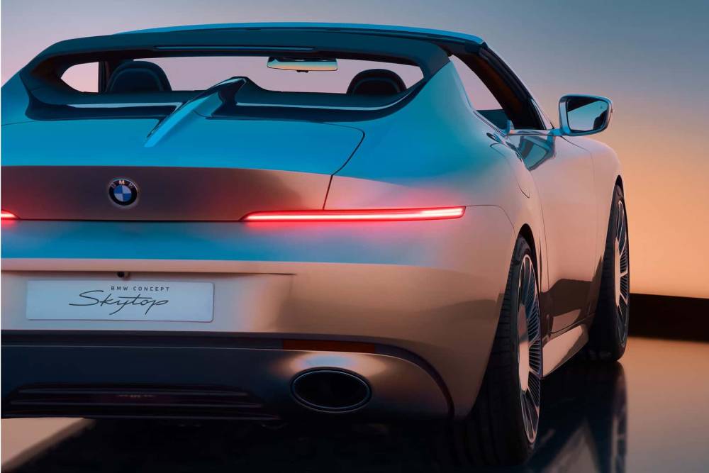 Οι καθαρές σχεδιαστικές γραμμές της Skytop εμπνέουν την επιθυμία για ταξίδια. Οι διευρυμένες, μυώδεις επιφάνειές της ορίζονται από γραμμές που έχουν σχεδιαστεί με ακρίβεια κατευθύνοντας τον όγκο του οχήματος προς τα πίσω. Τα winglets, τα οποία είναι διακριτικά ενσωματωμένα στους ώμους των θυρών, αντικαθιστούν τις συμβατικές χειρολαβές τους. Οι ζάντες ελαφρού κράματος με τις ακριβείς πτυχώσεις τους ενισχύουν περαιτέρω τη μοναδική της εμφάνιση. Παρατηρώντας την από ψηλά, το προτεταμένο καπό με την έντονη κυρτότητα, η εμβληματική σχεδίαση του ρύγχους καρχαρία της BMW με τη φωτιζόμενη μάσκα νεφρών και το αφαιρούμενο πίσω τμήμα, προσελκύουν το βλέμμα. Οι αναφορές στη Z8, έχουν επιλεγεί με προσοχή. Ιδιαίτερα εντυπωσιακή είναι η έντονη σφηνοειδής ακμή που εκτείνεται από το καπό, και μέσω του εσωτερικού καταλήγει σε ένα αλουμινένιο διακοσμητικό που βρίσκεται τοποθετημένο στην πίσω πόρτα, τονίζοντας τη δυναμική ροή της σιλουέτας.