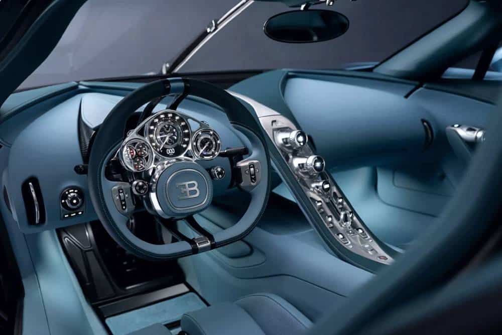 Ανοίγοντας προς τα πάνω την πόρτα του οδηγού (α λα McLaren) και μπαίνοντας στην καμπίνα, καταρχάς σε εντυπωσιάζει ο μινιμαλισμός. Ελάχιστοι διακόπτες και κουμπιά, το χαρακτηριστικό τιμόνι των Bugatti, ένας πανέμορφος πίνακας οργάνων που μιμείται τους χρονογράφους, και πουθενά οθόνες! Η Tourbillion πάει κόντρα σε όλα τα ήθη και έθιμα των σύγχρονων αυτοκινήτων, αφήνοντας τον οδηγό να απολαύσει με την ησυχία του το εσωτερικό και τη σύνδεση με τη μηχανή. Οθόνη υπάρχει βέβαια, αλλά είναι κρυφή (αναδιπλώνεται μόλις βάλεις μπροστά) και δεν ξεπερνά τις 8 ίντσες – ίσα για να ελέγχεις τις λειτουργίες του hypercar, κάτι που μπορείς να κάνεις και μέσω του smartphone σου με την ανάλογη εφαρμογή. Τι ελέγχεις;