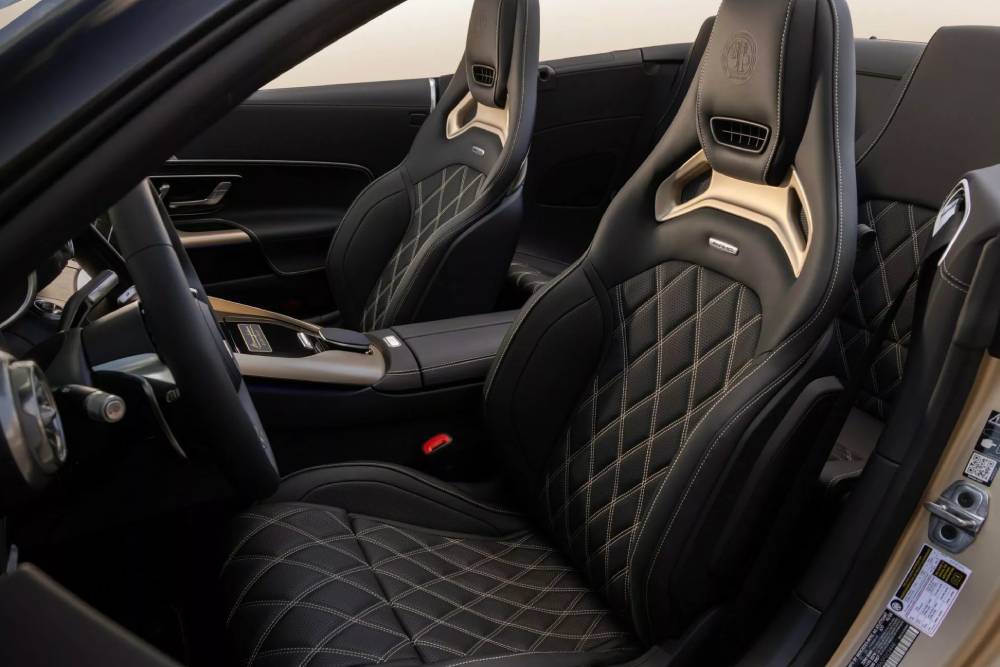Και οι ιδιαίτερες πινελιές δεν τελειώνουν εκεί. Στο υπερ-πολυτελές εσωτερικό βρίσκουμε τα κλιματιζόμενα καθίσματα AMG Performance, επενδυμένα με μαύρο δέρμα Nappa και χρυσές ραφές, όπως και στο τιμόνι AMG Performance, αλλά και τα πατάκια. Η κεντρική κονσόλα και το εσωτερικό των θυρών διαθέτουν ενθέσεις σε χρώμα Kalahari Gold, όπως και οι πλάτες των καθισμάτων. Αυτό μπορεί να βρεθεί και στις πλάτες των μπροστινών καθισμάτων. Τέλος, το σήμα «Manufaktur Golden Coast» υπενθυμίζει στους επιβάτες ότι δεν απολαμβάνουν μια απλή SL 63.