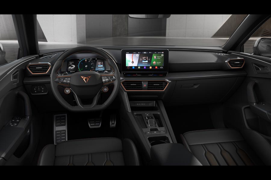 Αντίστοιχου χρώματος διακοσμητικά συναντώνται και στο εσωτερικό με τα μπακετ καθίσματα και το σπορ τιμόνι. Σε αυτό φιλοξενούνται τα μπουτόν για το enigne start και το CUPRA mode, με τις επιλογές Comfort, Sport, CUPRA και Individual.