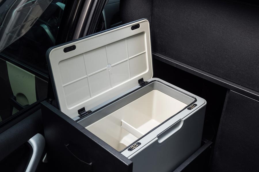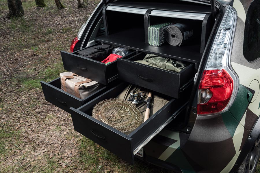 Περνώντας στο εσωτερικό, η δεύτερη σειρά καθισμάτων έχει αφαιρεθεί και τη θέση τους έχουν πάρει διάφορες ειδικά διαμορφωμένες θήκες και συρτάρια για να μπορούν να τοποθετηθούν ένα πτυσσόμενο τραπέζι, αναδιπλούμενες καρέκλες, καλάμια ψαρέματος, τσεκούρι, σχοινιά ρυμούλκησης, γαλότσες και ότι άλλο χρειαστεί ένας ψαράς ή κυνηγός. Επιπλέον, υπάρχει μια καφετέρια και ένα μικρό ψυγείο 20 λίτρων, καθώς και επιπλέον φωτισμός. Περισσότερα πράγματα μπορούν να αποθηκευτούν και στην μπαγκαζιέρα οροφής.