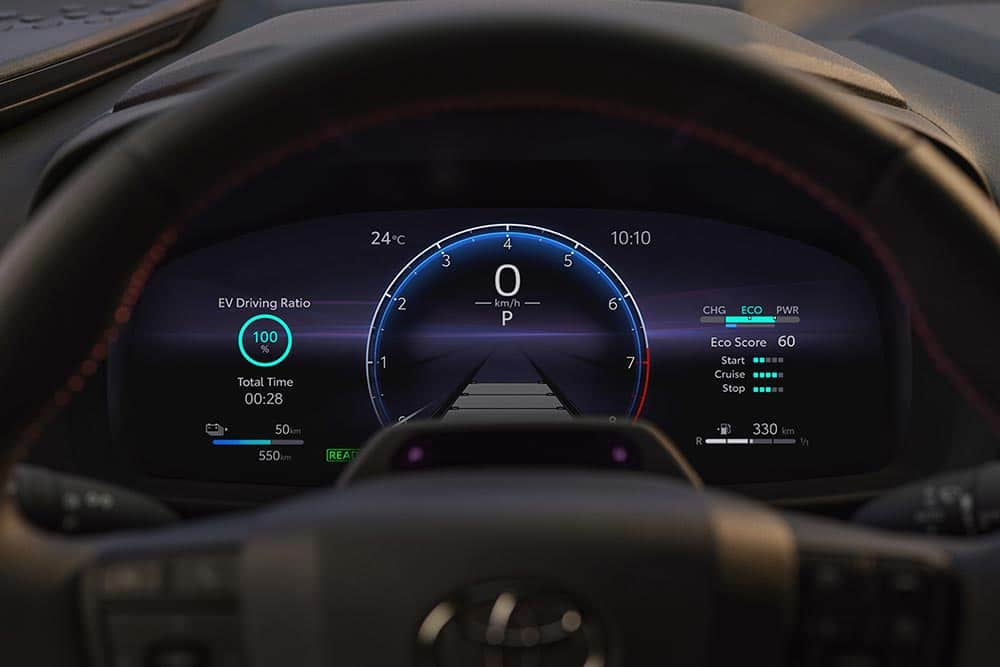 Στο εσωτερικό δεσπόζει ο ψηφιακός πίνακας οργάνων 12,3 ιντσών και η ανάλογης διαγωνίου οθόνη αφής στην κορυφή του ταμπλό (στις πλουσιότερες εκδόσεις, 8 ιντσών στις βασικές), που παρέχει έλεγχο στις λειτουργίες του αυτοκινήτου και του συστήματος πολυμέσων Toyota Smart Connect. Αναλόγως εξοπλιστικού επιπέδου, το νέο C-HR προσφέρει πανοραμική ηλιοροφή, ambient φωτισμό 64 διαφορετικών αποχρώσεων και premium ηχοσύστημα της JBL. Παράλληλα παρέχεται ο χειρισμός διαφόρων λειτουργιών (όπως του κλιματισμού) εξ αποστάσεως δια smartphone, μέσω της εφαρμογής MyT.