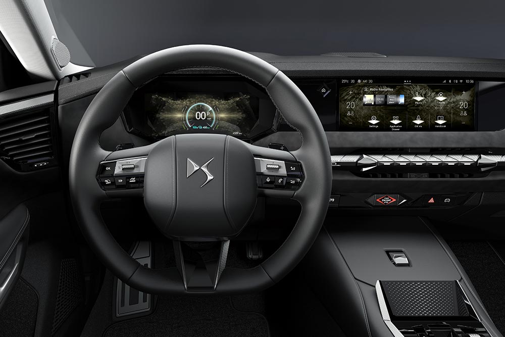 Στο εσωτερικό, το νέο DS N°4, η πολυτελής ατμόσφαιρα ενισχύεται από τα ανάγλυφα ένθετα «Clous de Paris», ένα φινίρισμα εμπνευσμένο από την υψηλή ωρολογοποιία. Μπροστά από τον οδηγό, ένας νέος ψηφιακός πίνακας οργάνων υψηλής ευκρίνειας 10,25 ιντσών, προσφέρει καλύτερη αναγνωσιμότητα, σε συνδυασμό με το σύστημα DS Extended Head Up Display. Στο κέντρο του ταμπλό, μια δεύτερη οθόνη 10 ιντσών εξυπηρετεί τη λειτουργία του infotainment μέσω του συστήματος DS Iris System. Το εσωτερικό ντύνεται με υφάσματα και καμβά υψηλής ποιότητας που καλύπτουν γενναιόδωρα το ταμπλό, τα πάνελ των θυρών και την κεντρική κονσόλα. Mε μήκος 4,40 μ., πλάτος 1,87 μ., ύψος 1,47 μ. και μεταξόνιο 2,67 μ. το N°4 παρέχει αρκετές ανέσεις. Τα εμπρός καθίσματα με αφρό υψηλής πυκνότητας, που διατίθενται με λειτουργίες θέρμανσης, ψύξης και μασάζ στις εκδόσεις με δερμάτινη επένδυση, ακολουθούν μια ξεχωριστή προσέγγιση. Ο χώρος αποσκευών του N°4 διαθέτει 430 λίτρα για την έκδοση Hybrid, 360 λίτρα για το N°4 PHEV και 390 λίτρα για το νέο 100% ηλεκτρικό N°4 E-Tense.