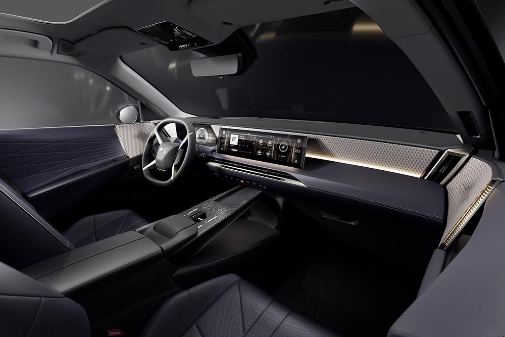 Το DS N°7 προσφέρει μεγάλη ποικιλία επιλογών για το εσωτερικό, καλύπτοντας τα καθίσματα, το ταμπλό, την κεντρική κονσόλα και τα πάνελ των εμπρός και πίσω θυρών. Οι επιβάτες του DS N°7, είτε κάθονται εμπρός είτε πίσω, απολαμβάνουν το ίδιο υψηλό επίπεδο προσοχής και ποιότητας φινιρίσματος. Οι μεγάλες αυτές επιφάνειες καλύπτονται από μαλακά πολυτελή υλικά και αναδεικνύονται με αντιθέσεις στις ραφές ή ανάγλυφα μοτίβα, ενώ μπορούν να συνδυαστούν με διακοσμητικά από βουρτσισμένο αλουμίνιο ή πραγματικό ξύλο, ανάλογα με την επιλεγμένη έκδοση. Ο ψηφιακός πίνακας οργάνων 10 ιντσών και η κεντρική οθόνη αφής 16 ιντσών ενσωματώνονται με κομψό τρόπο στο ταμπλό.