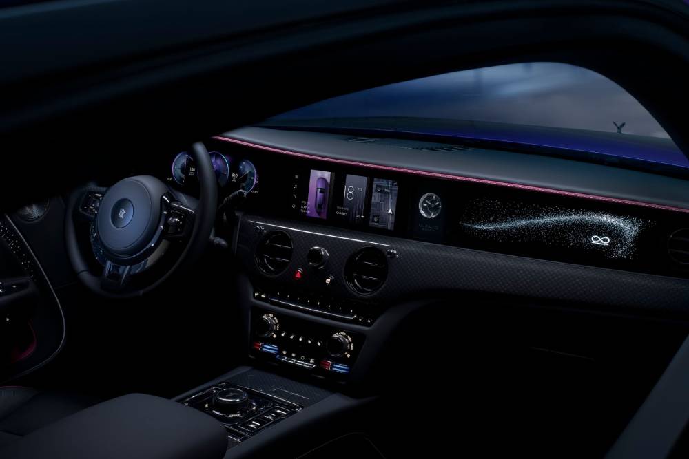 Στο εσωτερικό οι επενδύσεις μιμούνται το χρώμα του αμαξώματος (μωβ εν προκειμένω), τα 5.500 LED στο ταμπλό δημιουργούν μια φαντασμαγορική ατμόσφαιρα, ο «έναστρος ουρανός» το ίδιο, το εξαιρετικό σύστημα Bespoke Audio 18 ηχείων, που επωφελείται από τον ενισχυτή 18 καναλιών τελευταίας γενιάς 1400 Watt, φροντίζει για τις ηχητικές απολαύσεις των επιβατών, ενώ τα νέα μπάκετ αναλαμβάνουν να κρατούν άπαντες στις θέσεις τους όταν πατιέται τέρμα το δεξί πεντάλ. Και σε αυτές τις καταστάσεις, η Spectre Black Badge δεν αστειεύεται.
