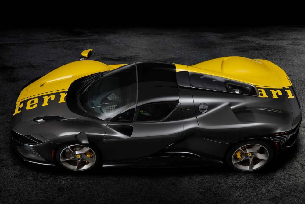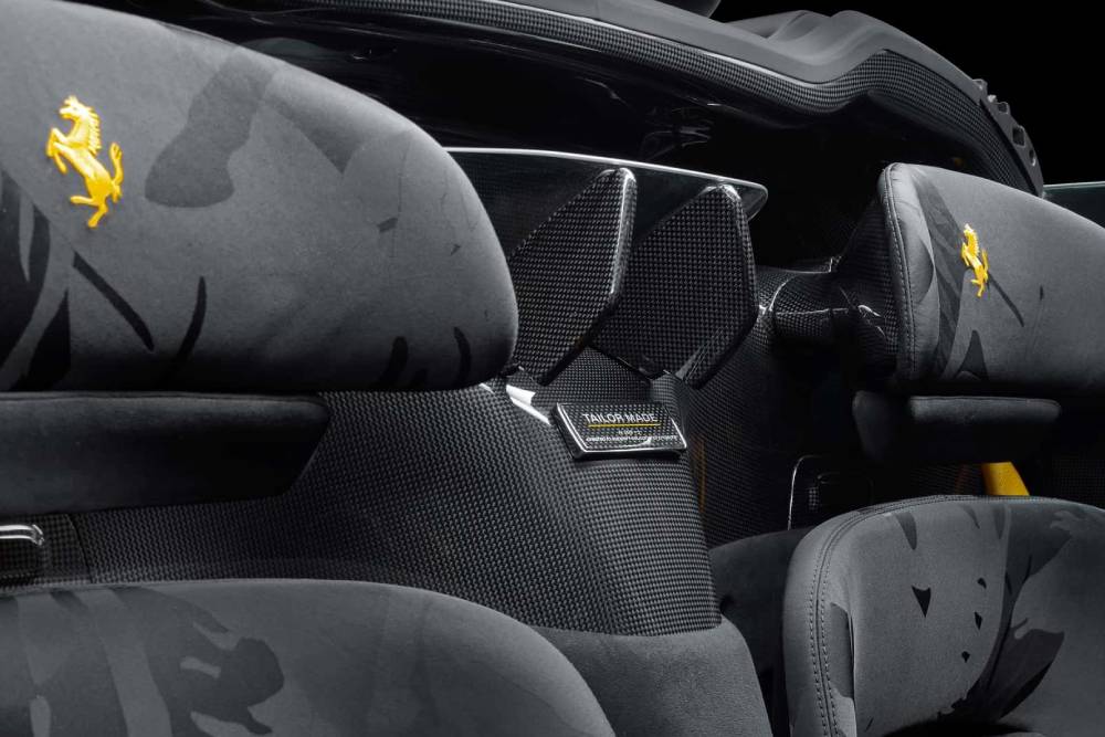 Η μία και μοναδική Daytona SP3 βάφεται στο παραδοσιακό Giallo Strato κίτρινο του Μαρανέλο, σε συνδυασμό με μια μαύρη διχρωμία που παραπέμπει ξεκάθαρα σε αγωνιστικό αυτοκίνητο – πρώτα από όλα βέβαια, αυτό το διακεκομμένο «Ferrari» που διατρέχει το ανθρακονημάτινο αμάξωμα. Ανάλογο μοτίβο και στο εσωτερικό, που εμπνέεται από τα κόκπιτ των μονοθεσίων της Scuderia στη Formula 1. Και εδώ το carbon είναι πρωταγωνιστής, σε συνδυασμό με την alcantara, ενώ η πλακέτα ανάμεσα στις πλάτες των καθισμάτων αποσαφηνίζει τη μοναδικότητα της εν λόγω SP3.