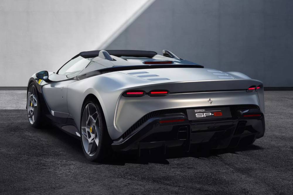 Η SP (βλέπε Special Projects) δεν είναι απλά μια F8 Spider με διαφορετική σχεδίαση. Το «κοστούμι» αποτελείται εξ ολοκλήρου από ανθρακονήματα, με τη διχρωμία να εντείνει την αιχμηρότητα των γραμμών και να χαρίζει ακόμα πιο ιδιαίτερο οπτικό αποτέλεσμα. Σε αυτό συντελούν τα νέα και φιμέ φωτιστικά σώματα εμπρός, όπως και η ολοκαίνουργια αλουμινένια μάσκα που αποτελεί 100% προϊόν 3D εκτύπωσης. Στο πίσω μέρος συναντάμε τα φανάρια της Roma, αλλά με νέα καλύμματα, ενώ εμφανής είναι και η πιο αεροδυναμική προσέγγιση εκεί. Χαρακτηριστικός ο τεράστιος διαχύτης που ορίζει το κάθετο σχήμα των εξατμίσεων, όπως και το spoiler που σχηματίζεται στο άνω άκρο.