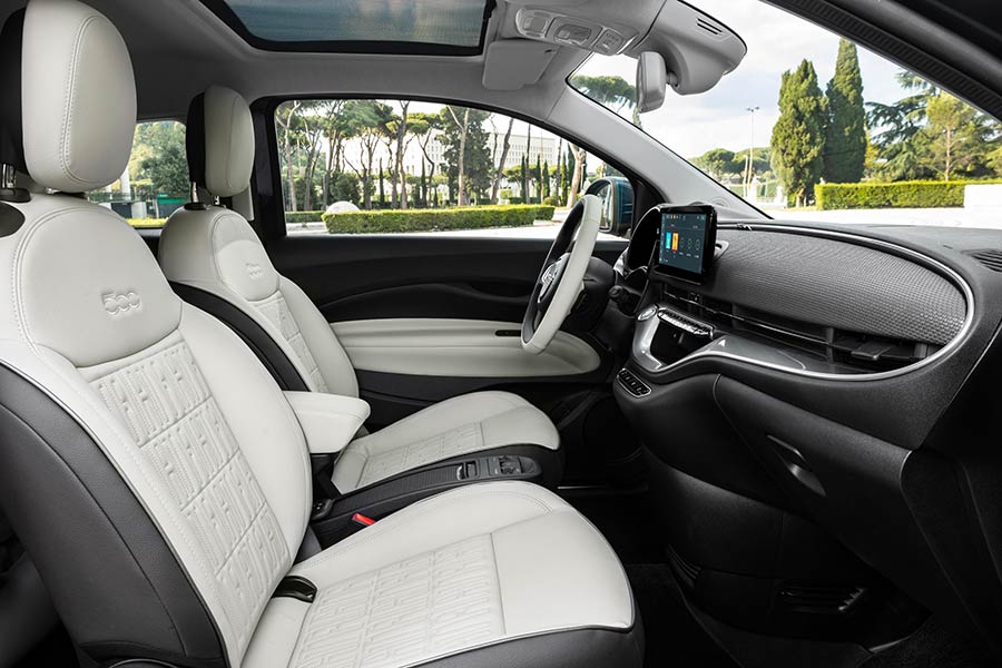 Κυρίαρχο χαρακτηριστικό του νέου ηλεκτρικού 500 «la Prima» hatchback αποτελεί η γυάλινη πανοραμική οροφή. Το πίσω μέρος διαθέτει πλέον μια κλασσική 3η πόρτα για το χώρο αποσκευών, καθώς και ένα νέο σπόιλερ για ακόμα καλύτερη αεροδυναμική. Διαθέσιμοι είναι τρεις χρωματισμοί: Ocean Green (πέρλα), Mineral Grey (μεταλλικό) και Celestial Blue (τριών επιστρώσεων).