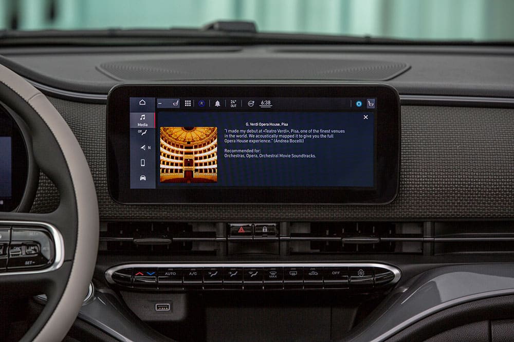 Η προηγμένη τεχνολογία «Virtual Venues» της JBL εξελίχθηκε σε συνεργασία με τον Μαέστρο Bocelli ώστε να προσφέρει μια νέα εμπειρία ήχου, ιδανική για ένα αθόρυβο αμιγώς ηλεκτρικό αυτοκίνητο όπως το νέο Fiat 500. Το σύστημα προσφέρει τέσσερα προγράμματα που δημιουργούν συνθήκες αντίστοιχες με μέρη που ο Ιταλός τενόρος αγαπά να απολαμβάνει τη μουσική: