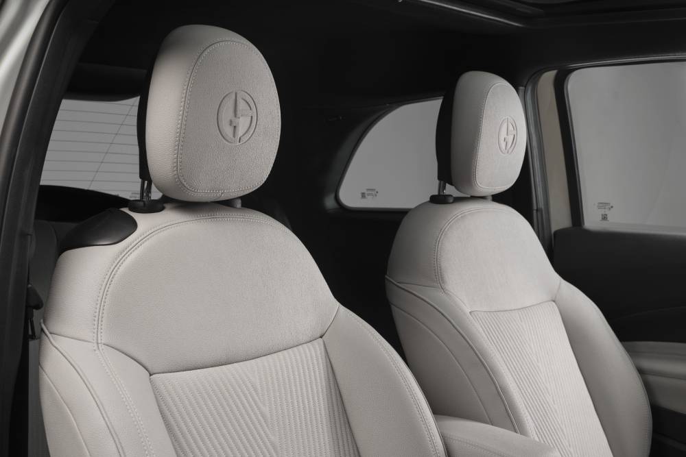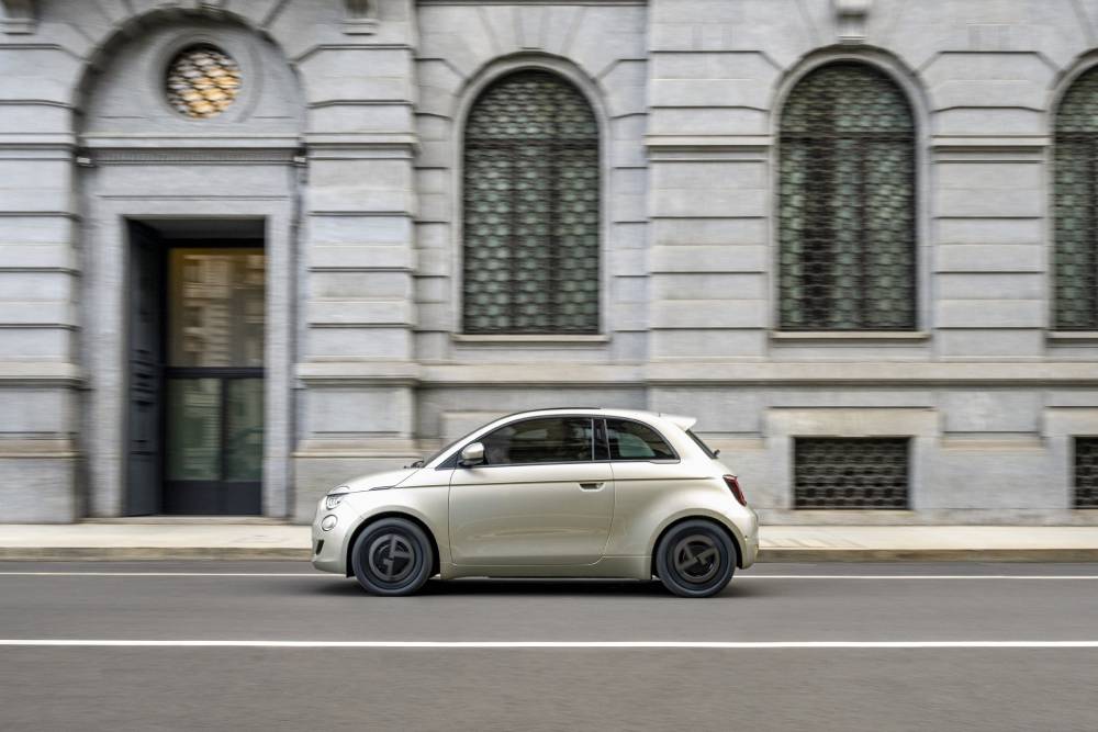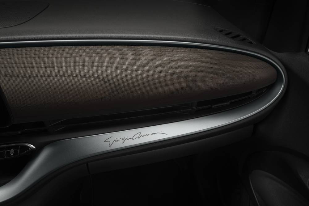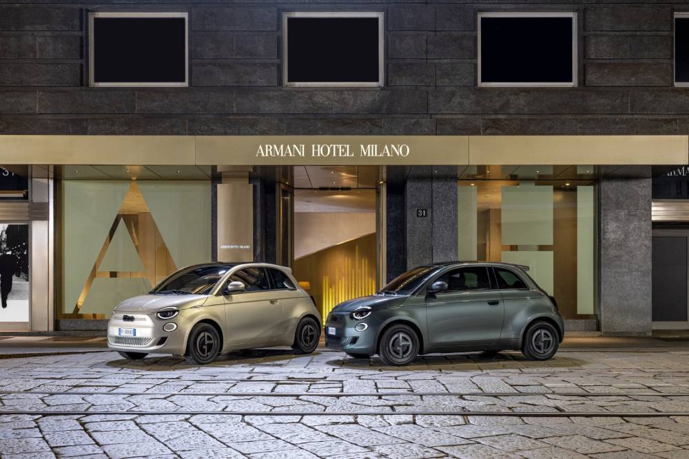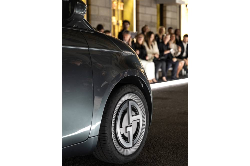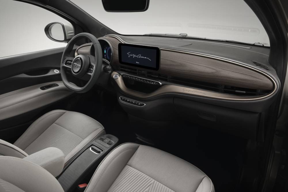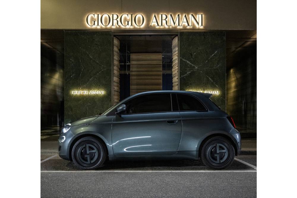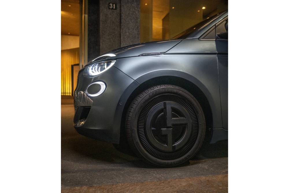 Απόλυτες πρωταγωνίστριες στην εμφάνιση του 500e Giorgio Armani, οι ζάντες. Το περίτεχνο και ιδιαίτερο σχέδιο, που θυμίζει καλλιγραφία, είναι το μονόγραμμα «GA» που απεικονίζει τα αρχικά του θρυλικού σχεδιαστή. Αν εξαιρέσουμε τους ειδικά σχεδιασμένους τροχούς, οι διαφορές του 500e Armani από τα υπόλοιπα αφορούν τα δυο αποκλειστικά χρώματα (Dark Green Micinalised ή Ceramic Greige) και τις ανάγλυφες επιγραφές στη βάση των πίσω κρυστάλλων. Στο εσωτερικό βρίσκουμε ειδικά σηματάκια, την υπογραφή του Giorgio Armani στην οθόνη καλωσορίσματος του infotainment και στη φάσα του ταμπλό, το μονόγραμμα κεντημένο στα προσκέφαλα και επένδυση στο πάνω μέρος του ταμπλό, που είναι μεν ύφασμα αλλά έτσι σχεδιασμένο ώστε να θυμίζει οπτικά ξύλο.