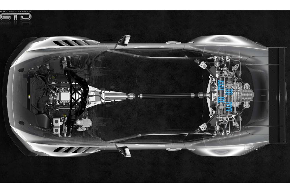 Όπως φανερώνουν οι αεραγωγοί στο καπό και τα φτερά εμπρός-πίσω, κάτω από το «πολεμικό» look στεγάζεται ένα ριζικά αναβαθμισμένο και αγωνιστικών καταβολών μηχανολογικό υπόβαθρο. Πρώτος και καλύτερος ο κινητήρας, ειδικά η τοποθέτησή του. Ο 5.2 V8 έχει μετακινηθεί προς τα πίσω, ανάμεσα στον εμπρός άξονα και τον οδηγό, καθιστώντας την Mustang GTD -τυπικά- ως κεντρομήχανη. Το ίδιο το μοτέρ τώρα, φιλοξενεί κομπρέσορα και αναβαθμίσεις σε πολλά περιφερειακά, βασιζόμενο στον Predator της προηγούμενης Shelby GT500. Ακριβές νούμερο ισχύος δεν ανακοινώνεται, ωστόσο το «Μπλε Οβάλ» δηλώνει πως βρίσκεται πάνω από τα 800 άλογα και στροφάρει άνετα στις 7.500 σ.α.λ.
