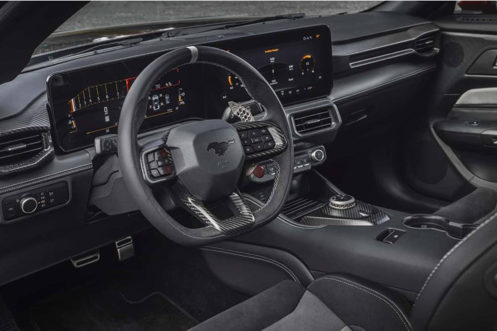 Πέρα από τον έξτρα εξοπλισμό, η Ford αποκάλυψε για πρώτη φορά και το εσωτερικό της Mustang GTD, το οποίο αλήθεια είναι δεν φέρνει ιδιαίτερα σε αγωνιστικό. Τα μπάκετ καθίσματα της Recaro και τα ανθρακονημάτινα πάνελ (λίγα) είναι βέβαια παρόντα, αλλά η μεγάλη ενιαία οθόνη (13,2 ίντσες ο ψηφιακός πίνακας οργάνων, 12,4 ίντσες το σύστημα πολυμέσων) κρατάει το προφίλ της GTD σε επιβατικά και πολυτελή στάνταρ.