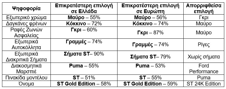 Οι χρήστες σε Twitter και Instagram σε Ευρώπη και Ελλάδα κατέθεσαν τις προτιμήσεις τους μέσω των καναλιών της Ford στα μέσα κοινωνικής δικτύωσης, δίνοντας σχεδόν 275.000 ψήφους. Οι ψηφοφορίες πραγματοποιήθηκαν σε διάστημα 10 ημερών, με τους συμμετέχοντες να επιλέγουν τους χρωματικούς συνδυασμούς στοιχείων όπως εξωτερικό φινίρισμα, αυτοκόλλητα και δαγκάνες φρένων – αποφασίζοντας ακόμα και το όνομά του.