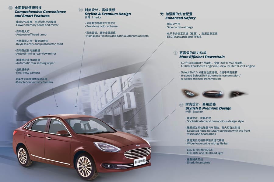 H Ford παρουσίασε στην Κίνα -παράλληλα με το νέο Focus– και το ανανεωμένο μικρομεσαίο σεντάν μοντέλο της Escort, το οποίο προορίζεται και είναι σχεδιασμένο ειδικά για τις ανάγκες τις τεράστιας αυτής αγοράς, όπου από το Δεκέμβριο του 2014 που λανσαρίστηκε έχει ξεπεράσει τις 800.000 πωλήσεις.