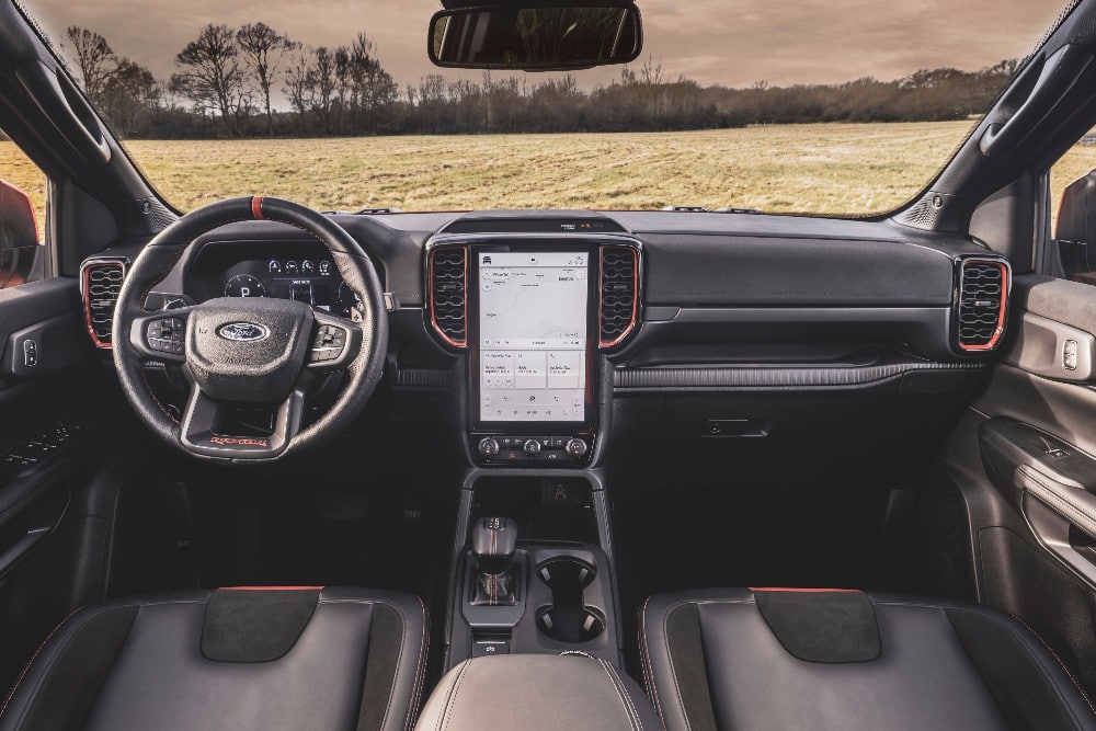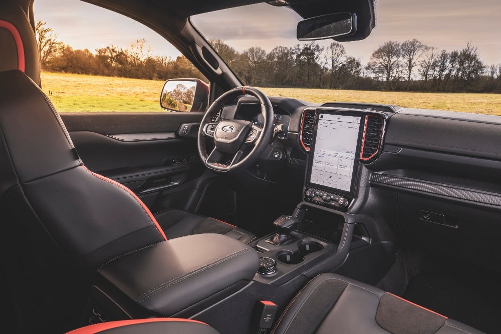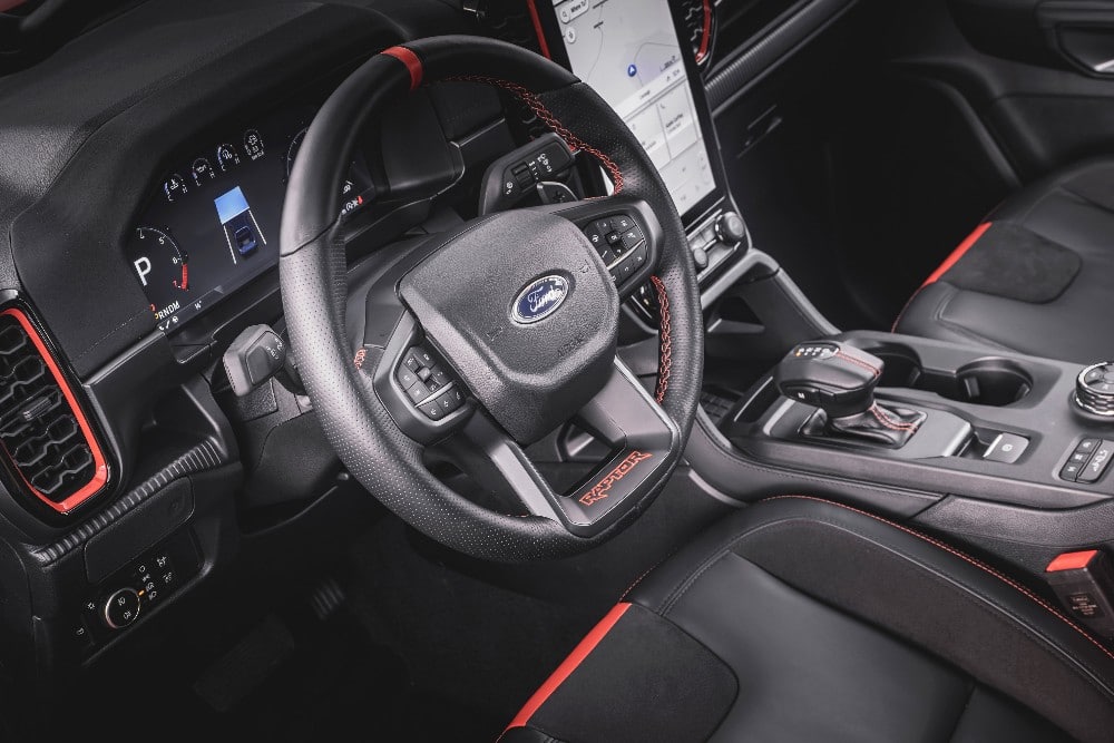 Για το εσωτερικό του νέου Ranger Raptor η σχεδιαστική ομάδα της Ford δεν θα μπορούσε παρά να δώσει τον καλύτερο εαυτό της αντλώντας έμπνευση και αξιοποιώντας στο ακέραιο την εξαιρετική βάση του νέου Raptor. Αυτό εμπλουτίστηκε στην κορυφαία και πιο ικανή εκδοχή του με έξτρα προσθήκες και πινελιές, που σε συνδυασμό αναβαθμίζουν ακόμα περισσότερο τόσο την high-tech αισθητική της καμπίνας, όσο και τον έντονα σπορτίφ χαρακτήρα της.