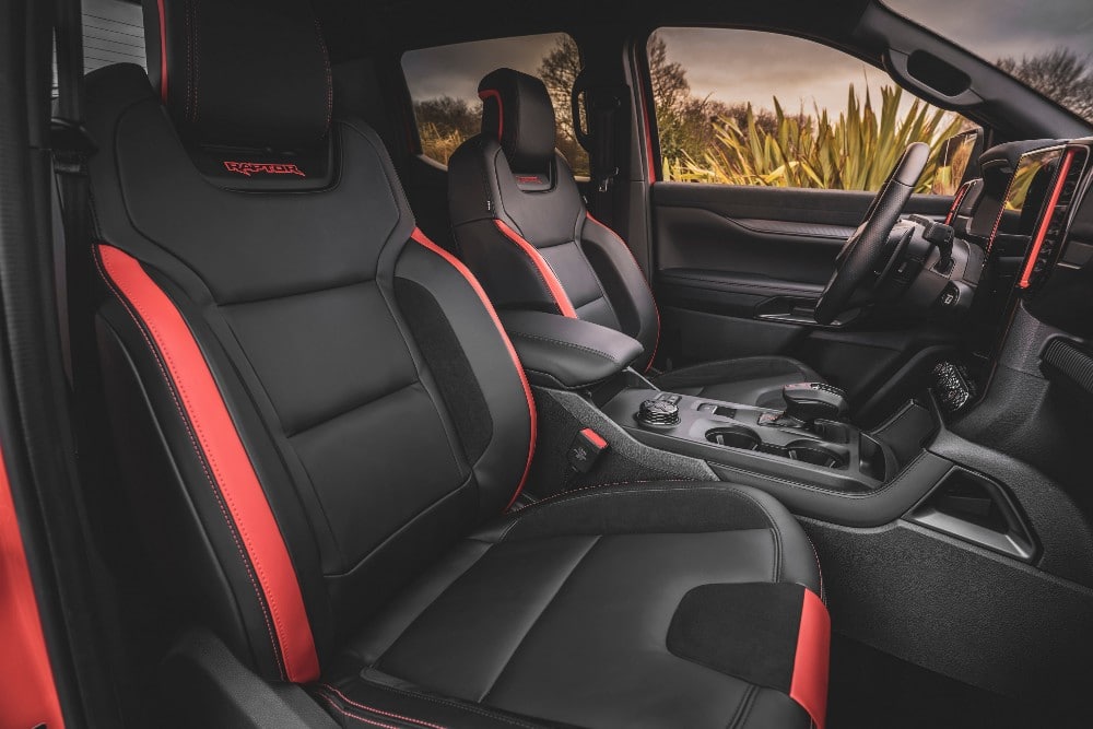 Όπως και οι εξωτερικές επιφάνειες, έτσι και το εσωτερικό τονίζει με τη σειρά του τον γεμάτο αυτοπεποίθηση, δυναμισμό και ενέργεια off-road χαρακτήρα του Ranger Raptor. Η καμπίνα περιλαμβάνει μεταξύ άλλων νέα και εμπνευσμένα από μαχητικά αεροσκάφη, σπορ καθίσματα μπροστά και πίσω, που αυξάνουν το επίπεδο άνεσης και προσφέρουν περισσότερη υποστήριξη στο σώμα, τόσο όταν το όχημα στρίβει με υψηλές ταχύτητες στην άσφαλτο όσο και στις off-road περιπλανήσεις στην ύπαιθρο.