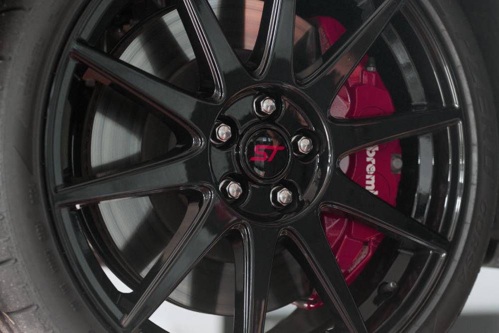 Στο δεύτερο σκέλος, οι προφανείς αναβαθμίσεις εντοπίζονται στις μαύρες πινελιές και τις νέες πολυάκτινες 19άρες ζάντες, οι οποίες είναι 10% ελαφρύτερες σε σχέση με τις εργοστασιακές. Η Agate Black απόχρωση τις ντύνει, όπως και τη μάσκα, την οροφή, τα καλύμματα των καθρεπτών, το διαχύτη, την αεροτομή και τις ενθέσεις στον εμπρός προφυλακτήρα. Τα «γερακίσια» μάτια θα παρατηρήσουν και τα μαύρα περιγράμματα στα σήματα «ST», αντί των χρωμιωμένων στο κανονικό. Αντιθέτως, τα φρένα της Brembo (363 χλστ. μπροστά) φαίνονται με τη μία, χάρις στις κόκκινες τετραπίστονες δαγκάνες. Σύμφωνα με τους μηχανικούς του «Μπλε Οβάλ», το νέο σύστημα πέδησης εμφανίζει μικρότερη φθορά και μεγαλύτερη αντοχή στην υπερθέρμανση, κατά τη διάρκεια επαναλαμβανόμενων γύρων σε πίστα.