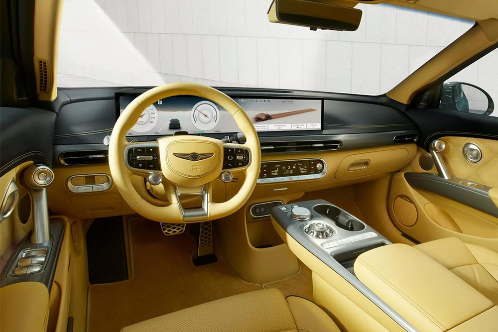 Στο πολυτελές εσωτερικό του ανανεωμένου Genesis GV60 κυριαρχεί η νέα ενιαία οθόνη των 27 ιντσών, η οποία ενσωματώνει τον πίνακα οργάνων και το Infotainment. Νέου σχεδιασμού, πιο κομψό και σπορτίφ από πριν είναι το τριάκτινο τιμόνι με τα νέα χειριστήρια. Τα υπόλοιπα τμήματα και χειριστήρια παρέμειναν ως είχαν.