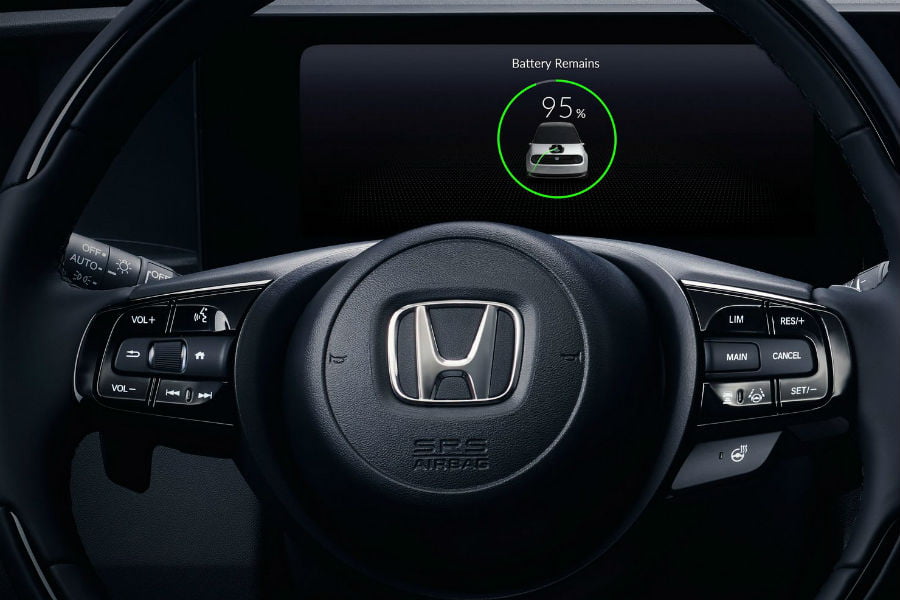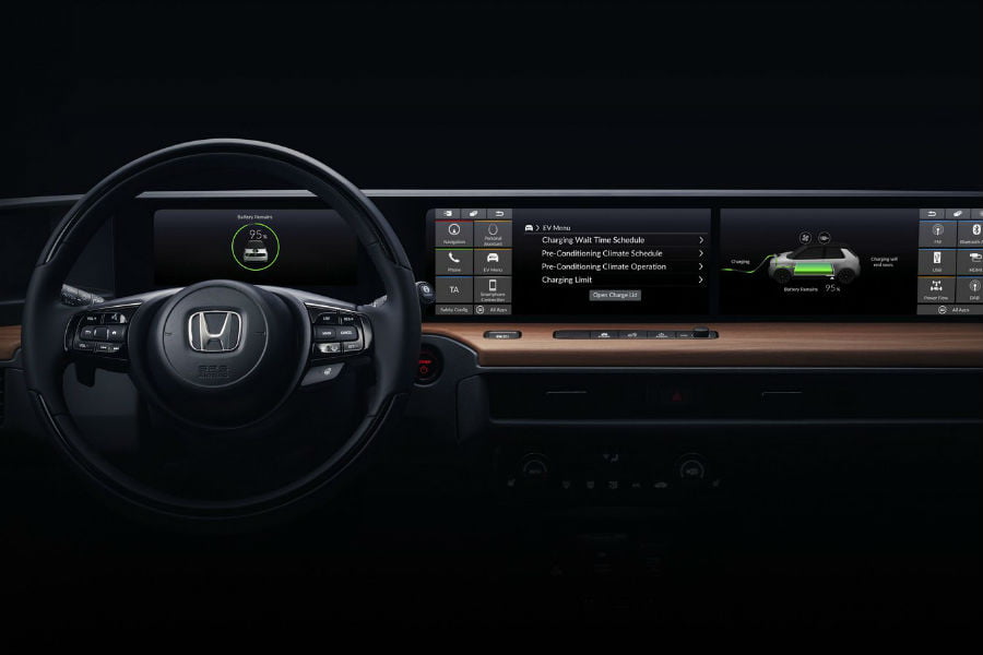 Για τον εσωτερικό του κόσμο, πάντως, έχουμε σχεδόν την πλήρη αποκάλυψη. Οι Ιάπωνες έδωσαν στη δημοσιότητα «σκοτεινές» φωτογραφίες από το ταμπλό, στις οποίες ωστόσο φαίνεται ξεκάθαρα ο φουτουριστικός τόνος που ακολουθείται στη διαμόρφωση των γραμμών. Το πρώτο που κεντρίζει τα βλέμματα είναι η διάταξη του πίνακα οργάνων, ο οποίος εκτείνεται σε όλο το πλάτος του ταμπλό και αποτελείται από 5 διαφορετικές οθόνες. Η επιλογή αυτή έχει σκοπό την αποφόρτιση της κεντρικής κονσόλας από ευμεγέθεις οθόνες και την απόσπαση στην προσοχή του οδηγού που μπορεί να προκαλέσουν, εξυπηρετώντας παράλληλα τον high tech προσανατολισμό του ηλεκτρικού Honda.