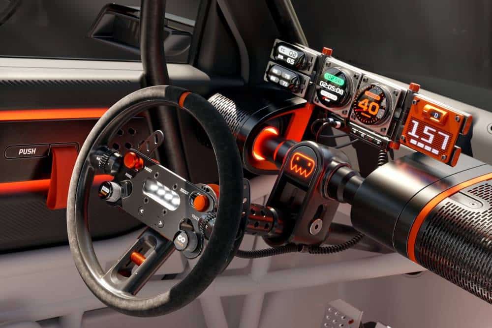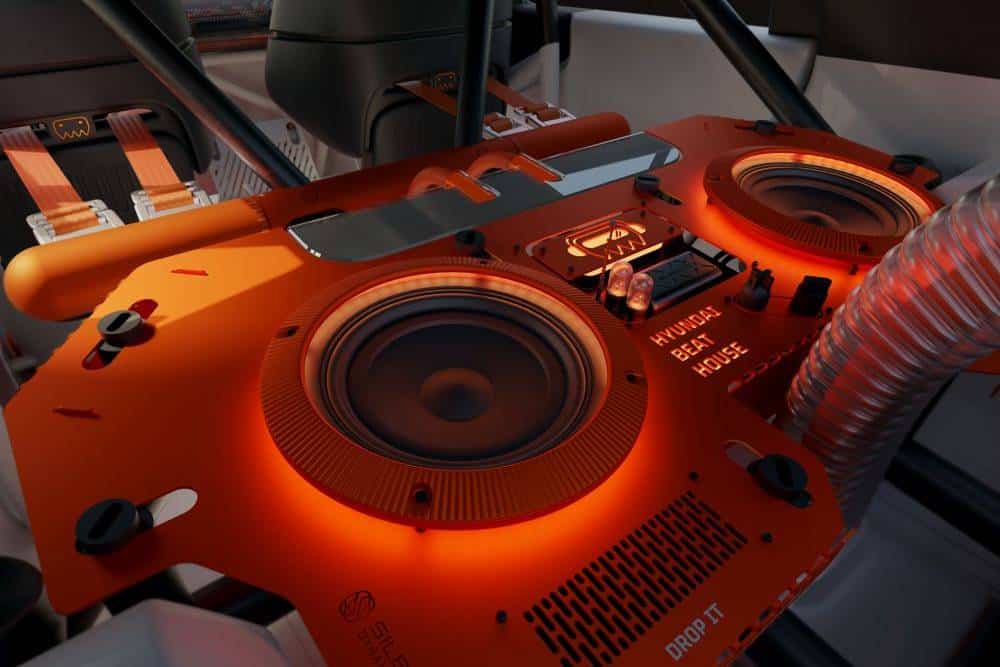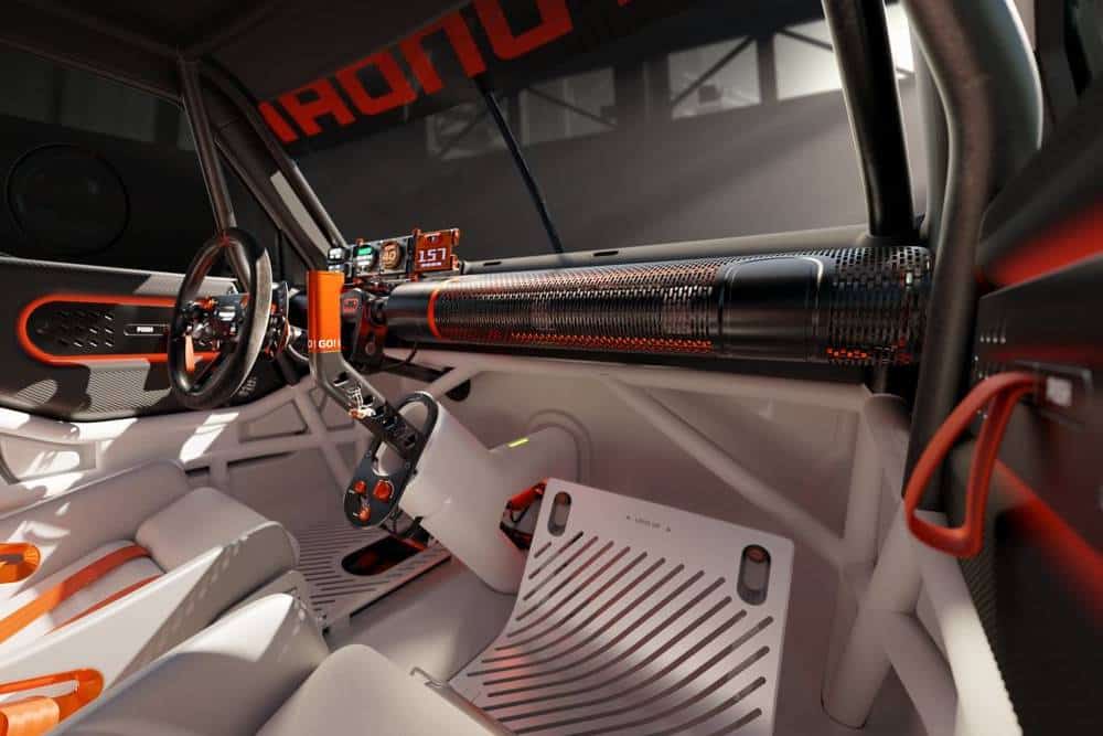 Ουδεμία σχέση με Inster παραγωγής το εσωτερικό, που περισσότερο παραπέμπει στα αγωνιστικά i20 Rally1 του WRC. Πλήρες roll cage, μπάκετ καθίσματα, σύστημα πυρόσβεσης, τα απολύτως απαραίτητα στο ταμπλό, «γυμνές» πόρτες και ένα χορταστικό χειρόφρενο να ξεπροβάλλει από την κεντρική κονσόλα, συνεπικουρούμενου Drift Mode για ατελείωτες πλαγιολισθήσεις. Το ηχοσύστημα Beat House από τη μεριά του, υπόσχεται non stop ακουστικές απολαύσεις.