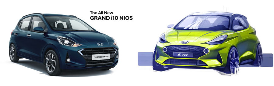 Συγκρίνοντας τα δύο μοντέλα βλέπουμε ότι τα φωτιστικά σώματα έχουν το ίδιο σχήμα, οι γραμμές του καπό είναι παρόμοιες, τα νεύρα στα πλαϊνά είναι ίδια, ενώ και στο πίσω άκρο σχηματίζεται το γράμμα «X» στις πίσω κολόνες, όπου φιλοξενείται και το λογότυπο i10. Επίσης, στους καθρέπτες υπάρχουν τα φλας και στην οροφή οι ράγες. Εκεί που διαφέρει το νέο i10 για την Ευρώπη με το ινδικό Grand i10 Nios είναι το σχέδιο του εμπρός προφυλακτήρα.
