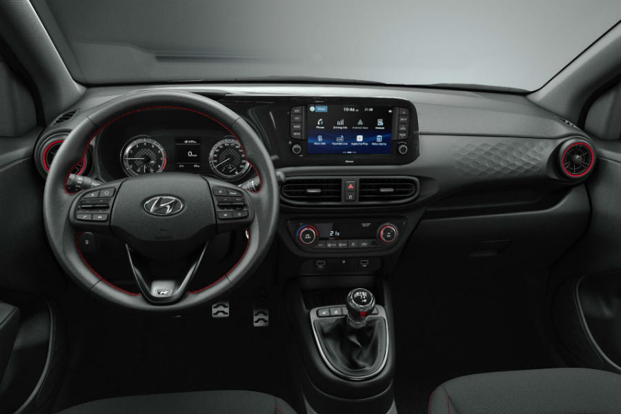 Εμφανισιακά το N Line ξεκαθαρίζει την θέση του σε σχέση με τα υπόλοιπα i10. Ο εμπρός προφυλακτήρας είναι ανασχεδιασμένος, με τα φώτα ημέρας στις γωνίες και τριγωνικούς ανακλαστήρες στο εσωτερικό της μάσκας, μαζί με το σήμα «Ν Line» και το κόκκινο χρώμα σε τρία τμήματα της γρίλιας αριστερά (δεξιά όπως το βλέπουμε), αλλά και το σιρίτι στο splitter. Οι 16άρες ζάντες αλουμινίου και τα κόκκινα σήματα στις πίσω κολόνες, είναι επίσης αποκλειστικά στοιχεία του i10 N Line.