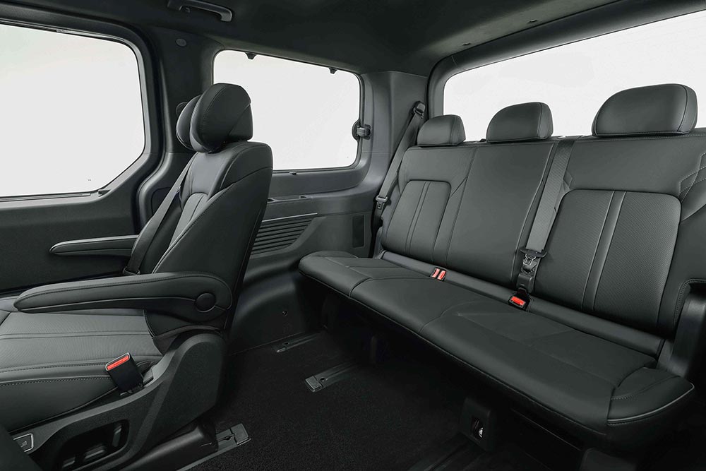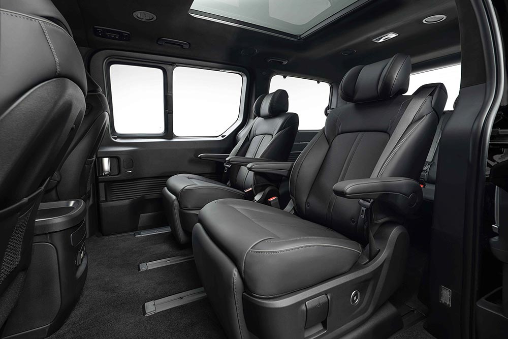 Κεντρικό στοιχείο αποτελεί η μοναδική αρχιτεκτονική χωροταξίας της Hyundai, που προσφέρει μια ευρύχωρη καμπίνα με έντονη αίσθηση ανοιχτού χώρου και ελευθερίας κίνησης. Το επίπεδο πάτωμα, οι μεγάλες εσωτερικές διαστάσεις και η ευφυής διάταξη των καθισμάτων δημιουργούν μια lounge ατμόσφαιρα, όπου οι επιβάτες μπορούν να χαλαρώσουν και να μετακινούνται άνετα. Το εσωτερικό έχει σχεδιαστεί έτσι ώστε να προσαρμόζεται ομαλά σε διαφορετικές ανάγκες, από την καθημερινή μετακίνηση και τα οικογενειακά ταξίδια έως την επαγγελματική μεταφορά επιβατών και τις δραστηριότητες αναψυχής.