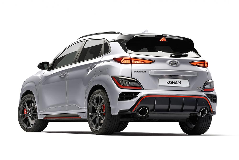 Ξεκινώντας με το «κουστούμι», αυτό είναι όσο άγριο επιβάλλει το σήμα Ν που φέρει πάνω του το νέο Kona. Το εμπρόσθιο τμήμα είναι τρομερά αρρενωπό, όπου και ξεχωρίζει η μεγάλη μάσκα, ενώ ιδιαίτερη εντύπωση κάνουν οι τρεις αεραγωγοί (όμοιους φέρει κι έκδοση N Line) στο καπό. Πολύ ωραία στο μάτι φαίνεται κι η κόκκινη ρίγα στο κατώτερο σημείο του προφυλακτήρα, τεχνοτροπία που συνεχίζεται στα πλαϊνά μαρσπιέ, αλλά και στον πίσω προφυλακτήρα. Εκεί υπάρχει επίσης κι ένας αιχμηρός διαχύτης, ο οποίος «αγκαλιάζει» τις απολήξεις του συστήματος εξαγωγής. Στο ανώτερο σημείο της πέμπτης πόρτας υπάρχει μια αεροτομή που ενισχύει τον σπορ χαρακτήρα του Kona, μαζί με το τριγωνικό φως για το στοπ!