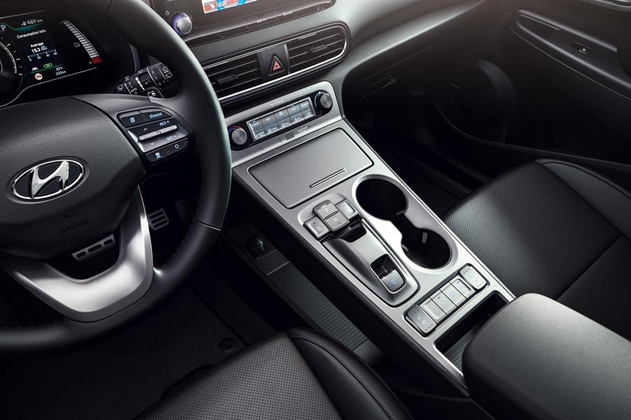 Στο μοντέρνο εσωτερικό του ηλεκτρικού Kona οι αλλαγές εστιάζονται στην προσθήκη νέου ψηφιακού πίνακα οργάνων με διαφορετικά γραφικά και ενδείξεις και στην τοποθέτηση μπουτόν στην κονσόλα για την επιλογή των ταχυτήτων, αντί του κλασικού επιλογέα.