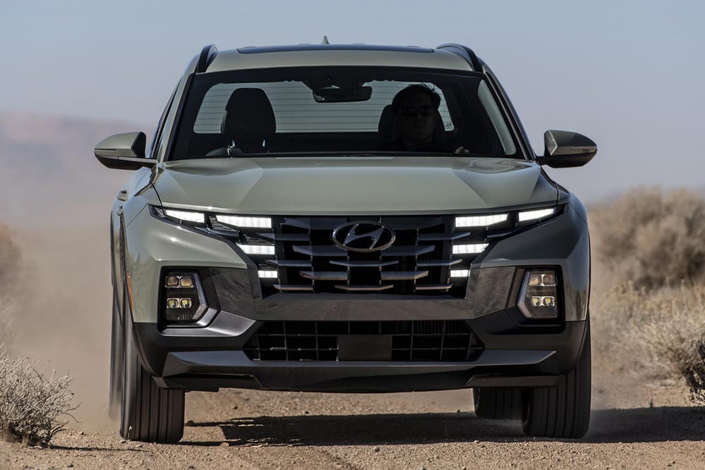 Παρά το γεγονός πως ανήκει στη σκληροτράχηλη κατηγορία των «αγροτικών» , το Santa Cruz διαθέτει ένα premium παρουσιαστικό, μιας και βασίζεται κατά πολύ στο Hyundai Tucson. Το μήκους 4.971 χλστ, πλάτους 1.905 χλστ., ύψους 1.694 χλστ., με μεταξόνιο 3.005 χλστ. Santa Cruz δανείζεται αρκετά σχεδιαστικά, αλλά και μηχανολογικά στοιχεία. Ξεκινώντας με τα της εμφάνισης, το εμπρόσθιο τμήμα ενσωματώνει την νέα μάσκα της Hyundai, η οποία ξεχωρίζει με τα παραμετρικά κοσμήματα, τα γνωστά μας «parametric jewels»! Εντυπωσιακός είναι όμως κι ο τρόπος που «φουσκώνει» ο προφυλακτήρας στις άκρες, κάτι που ενισχύει ακόμα περισσότερο το μυώδες παρουσιαστικό του Santa Cruz, συνδυαστικά με τη δυναμική ποδιά του προφυλακτήρα.