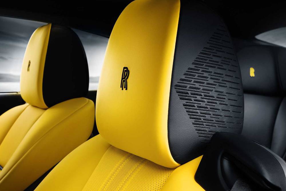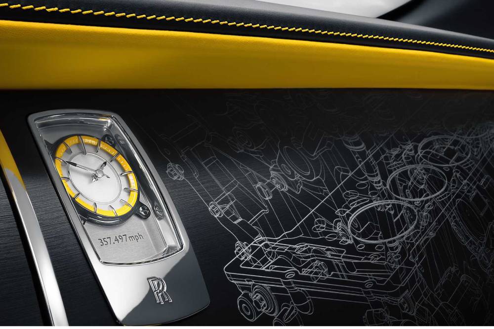 Περίτεχνα σχέδια έχουμε και στο εσωτερικό, το οποίο βρίθει κίτρινου χρώματος. Τα εμπρός καθίσματα, οι πόρτες και το εσωτερικό της στεφάνης στο τιμόνι ντύνονται στη φανταχτερή απόχρωση, όμως μια ματιά στο ταμπλό μπροστά από το συνοδηγό φανερώνει ένα ιδιαίτερο μοτίβο. Τι απεικονίζει; Απολύτως ταιριαστά, την διάταξη του V12 που χρησιμοποιούσε το Thunderbolt!. Ως γνήσια Rolls-Royce, δεν θα μπορούσε να λείπει η φωτιζόμενη επένδυση του «ουρανού», που απεικονίζει τη θέση των αστεριών στον ουρανό πάνω από το Bonneville κατά την επίτευξη του προ 80ετίας ρεκόρ!