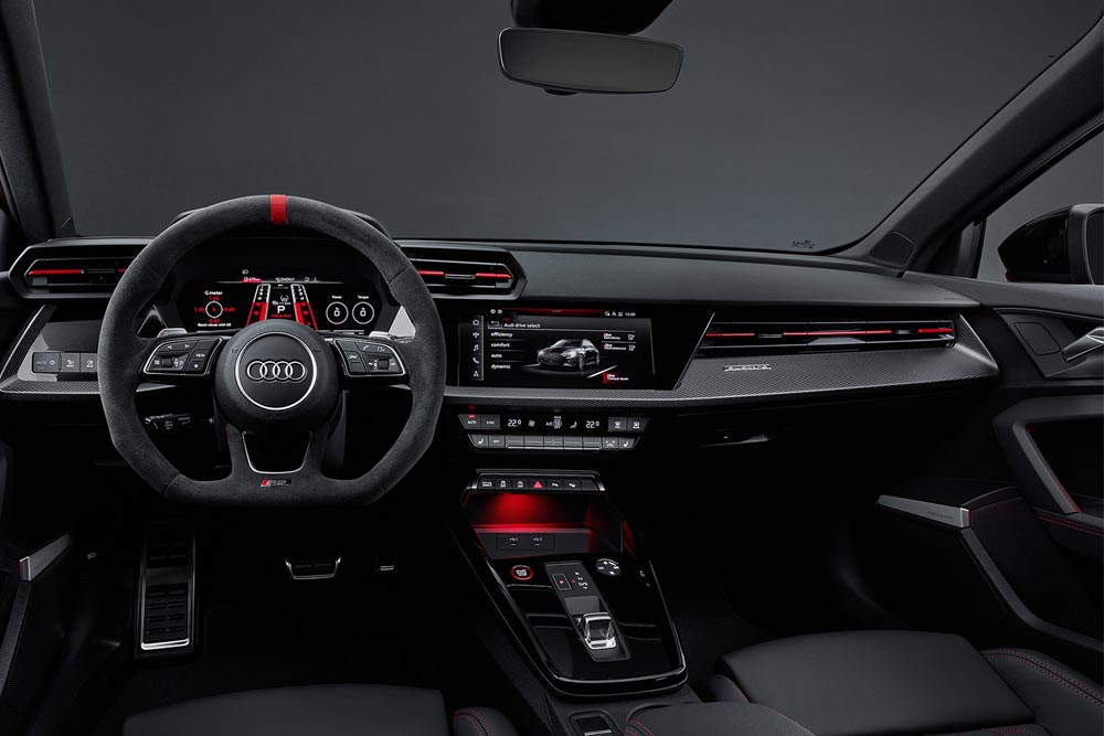 Στην καμπίνα του ισχυρού Audi RS 3 ξεχωρίζουν η οθόνη του Audi virtual cockpit plus σε διάσταση 12,3 ιντσών. Πέρα από την κλασική πληροφόρηση του οδηγού, το Audi virtual cockpit plus περιλαμβάνει την απεικόνιση των G της πλευρικής και γραμμικής επιτάχυνσης, τους χρόνους γύρου και την επιτάχυνση από 0-100 χλμ./ώρα, 0-200 χλμ./ώρα, κ.α.! Μάλιστα για ενισχυθεί ο σπορ χαρακτήρας του μοντέλου, ενσωματώνεται η ειδική RS ένδειξη αλλαγής ταχύτητας. Αυτή αναβοσβήνει στη λειτουργία χειροκίνητης μετάδοσης, αλλάζει την οθόνη του στροφομέτρου από πράσινο σε κίτρινο και σε κόκκινο, για να υποδείξει τον ιδανικό χρόνο αλλαγής ταχύτητας! Η αγωνιστική αίσθηση ενισχύεται περαιτέρω από τον πίνακα οργάνων από ανθρακονήματα και τα σπορ καθίσματα RS με ανάγλυφο RS και ραφές σε ανθρακί χρώμα.