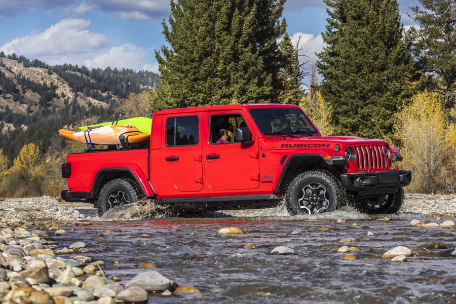 Για την ανυπέρβλητη ικανότητα και αποτελεσματικότητα εκτός δρόμου, φροντίζει ο συρφετός τεχνολογιών της Jeep. Η κίνηση μεταφέρεται σε όλους τους τροχούς μέσω δυο προσφερόμενων συστημάτων τετρακίνησης. Oι εκδόσεις Sport και Overland έχουν transfer case δυο ταχυτήτων με σχέση μετάδοσης 2.72:1, ενώ η πιο σκληροπυρηνική Rubicon διαθέτει το Rock-Trac 4×4 με λειτουργία 4LO, στην οποία το «κοντό» κιβώτιο έχει ακόμα πιο σφιχτή σχέση μετάδοσης στο 4:1, ενώ και η ανάρτηση έχει αυξημένες διαδρομές συνοδεία ηλεκτρονικά ελεγχόμενων αντιστρεπτικών. Όλα τα ανωτέρω οδηγούν σε μια εντυπωσιακή γωνία προσέγγισης 43,6 μοιρών, με αυτήν της διαφυγής να βρίσκεται στις 26 και της ράμπας στις 20,3 μοίρες, ενώ το Gladiator μπορεί ακόμα να ρυμουλκήσει έως και 3.450 κιλά.