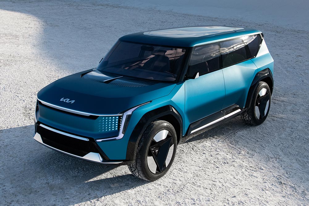 Το EV9 είναι μεγάλο και το δείχνει. Τα 4.930 χλστ. μήκους, 2.055 χλστ. πλάτους, 1.790 χλστ. ύψους και 3.100 χλστ. μεταξονίου εντείνονται σε οπτική αίσθηση, χάρις στο τετραγωνισμένο αμάξωμα και τις ευθείες γραμμές. Το εμπρός μέρος μαγνητίζει τα βλέμματα με το συνδυασμό χρωμίου και LED, που πλαισιώνει τη μεγάλη μάσκα. Μια μάσκα που στις άκρες της φιλοξενεί κρυφούς LED προβολείς, με τα ημέρας να τοποθετούνται κάθετα και δίπλα τους. Η τεχνοτροπία «Tiger Face» πηγαίνει ένα βήμα παραπέρα, συνδυαζόμενη με φουσκωμένα φτερά γεμάτα ακμές.